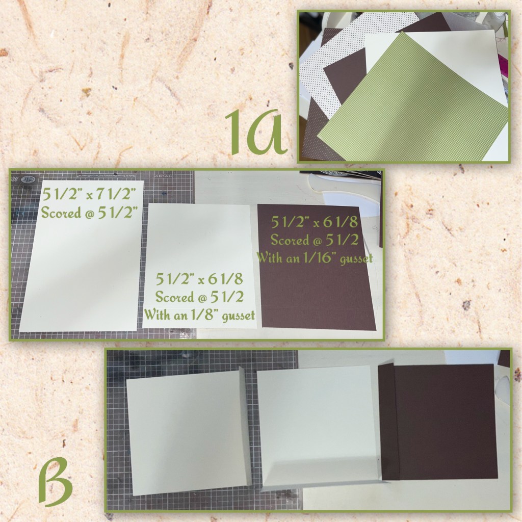 1A- I found brown and cream polka dot papers and a green patterned paper in my stash. I also used brown and cream cardstock. I cut and scored the bard base pieces as shown.