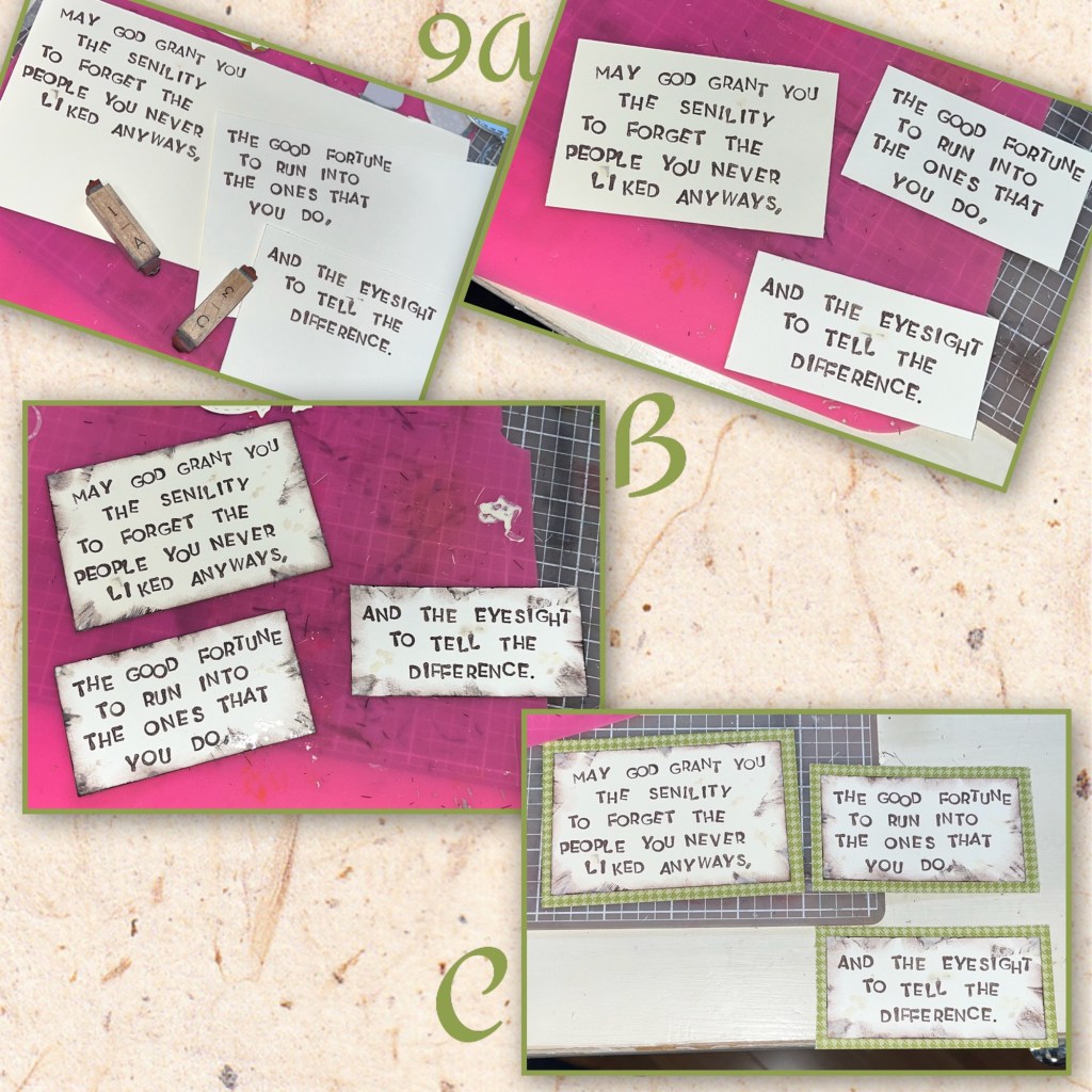 11A- I added a message block using some of the scraps. It is 2 3/4” x 3 3/4”, I inked it up like I did the word blocks, and added it to the right panel .