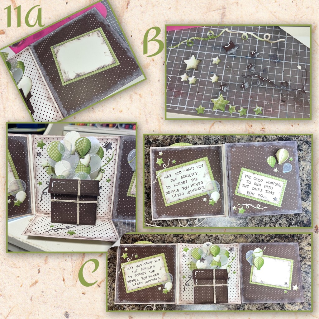 10A- I made a bow using the same twine as I used on the inside. I added the balloon and the bow to the card. I thought the green pattern and polka dot pattern was a lot so I added the brown square (4 3/4” square) between the Balloon and the card front.