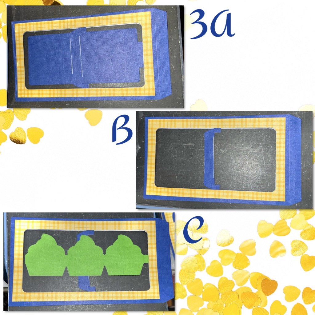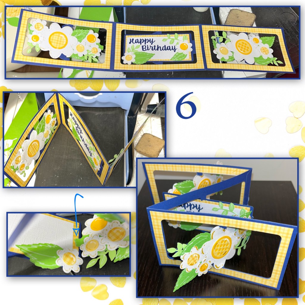 1A- cut out 3 blue cardstock and 6 (3 shown) yellow patterned paper using the Landscape Rectangle Accordion dieset.