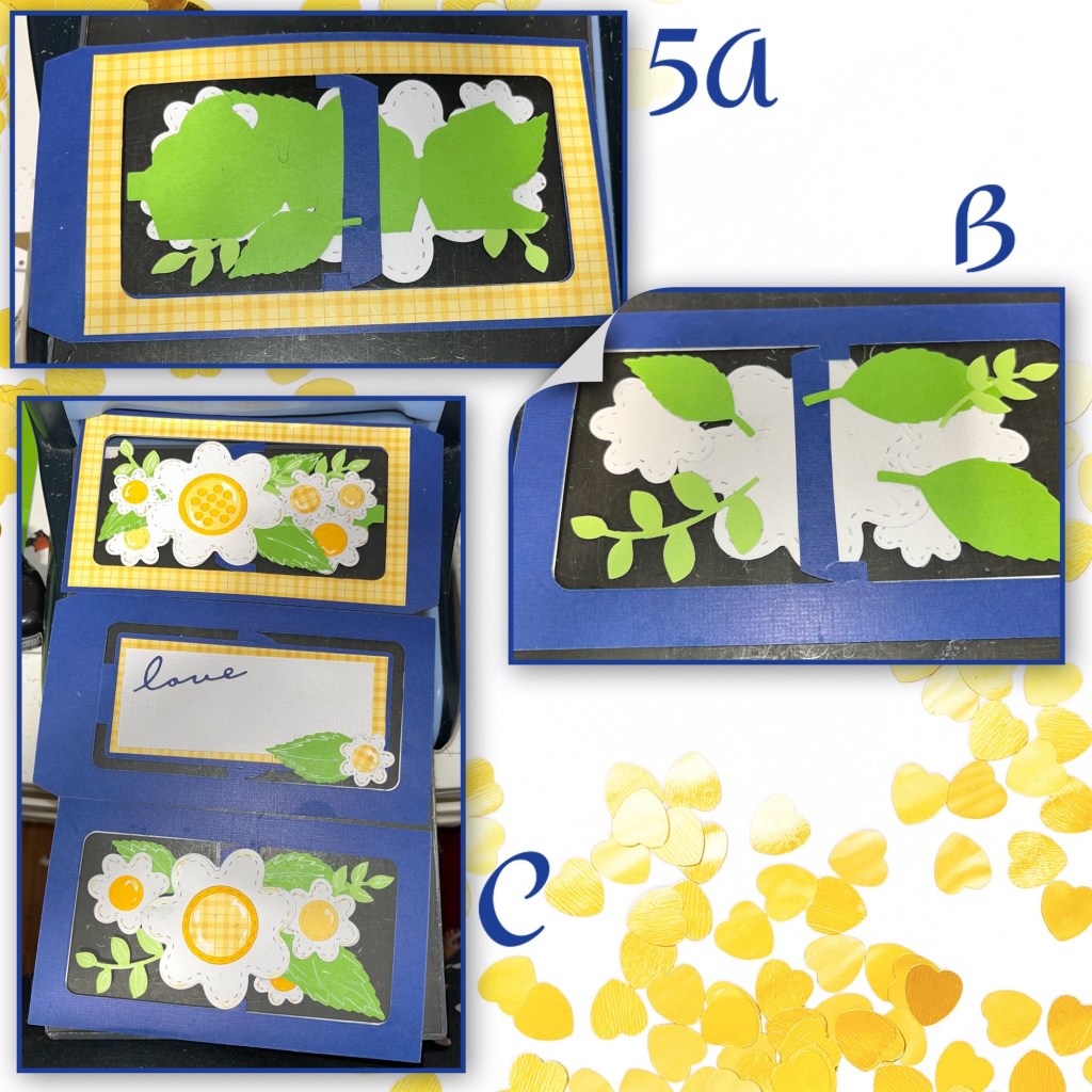 Add the yellow frames to the backside of the panels. I had to cut the frame to work it around the middle mechanism but it is not visible when completed. I also added gold marker and white gel pen to accent the daisys.