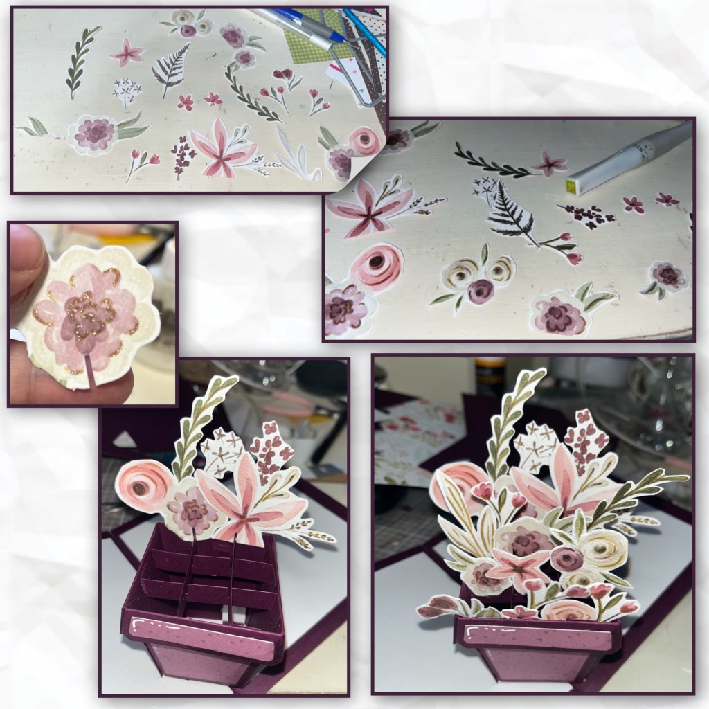 I fussy cut some flowers and foliage from the patterned paper and added highlights with the Wink of Stella, and the Gold Wink of Stella. I added the pieces to the flower pot, larger at the back and getting smaller to the front.