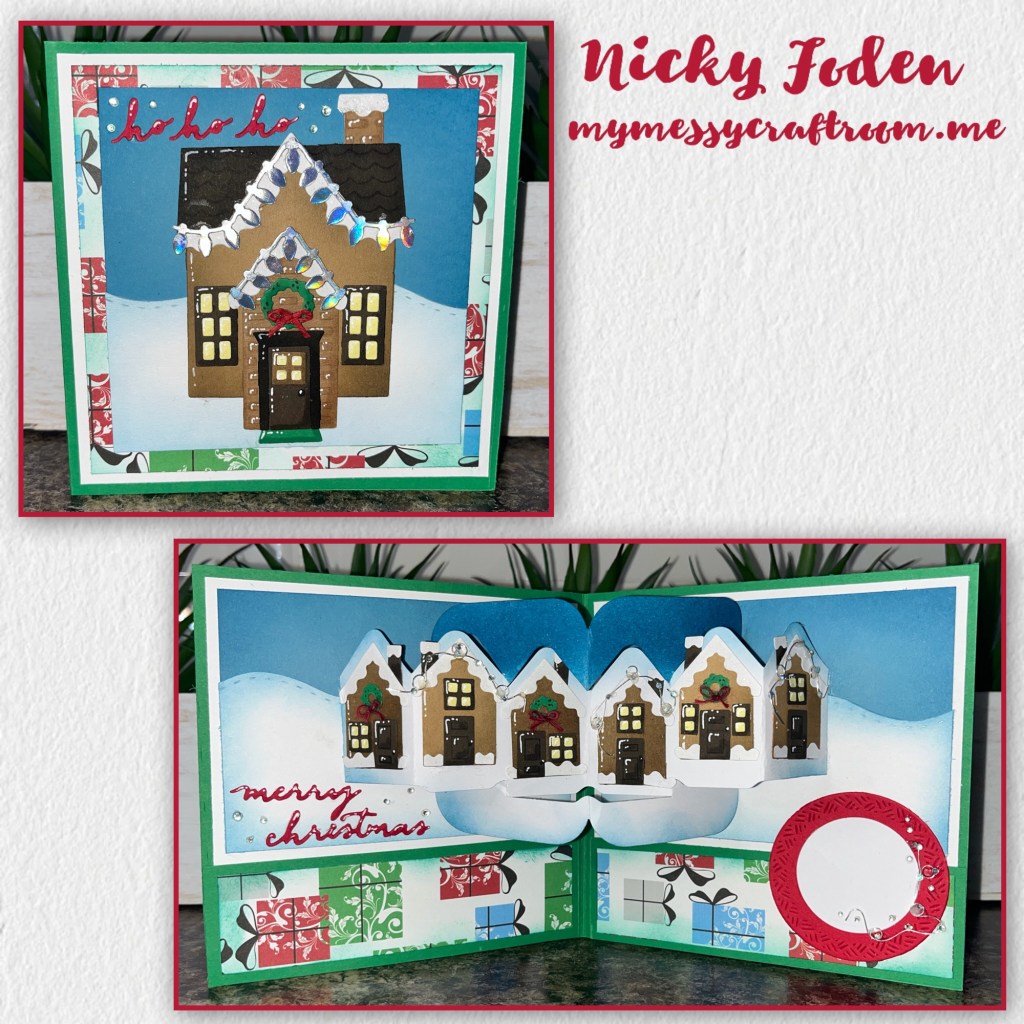 Add the House Pivot Panels mechanism to the card (Karen has a video tutorial on the product page at the link ⬆️) and add the little houses. Making sure the wire from the decorations does not get hung up in the folds.