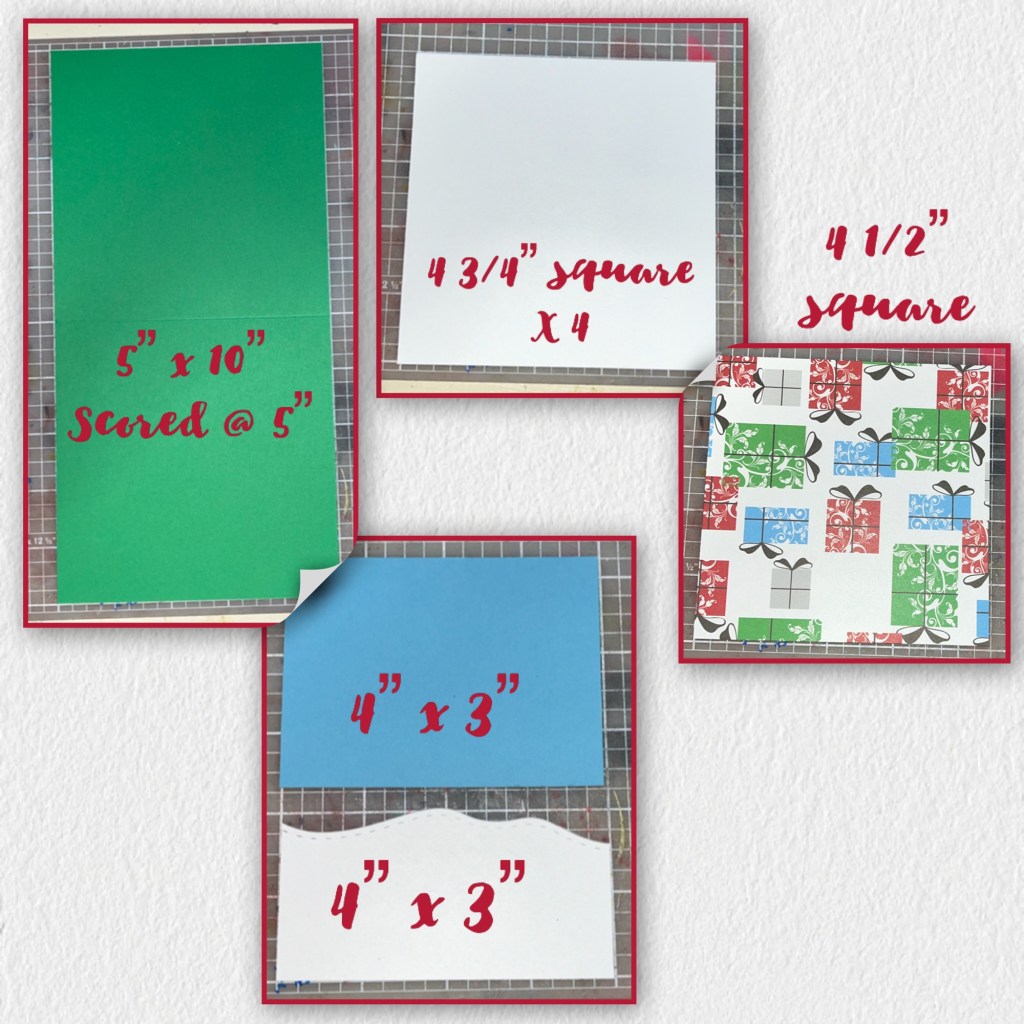 I started by choosing the festive paper which is retired Creative Memories, and I found a green and a blue to match. I cut the card base and panels as shown. The extra white panel ( shown with the blue) was cut with the Nature Edges to make snowy hills.