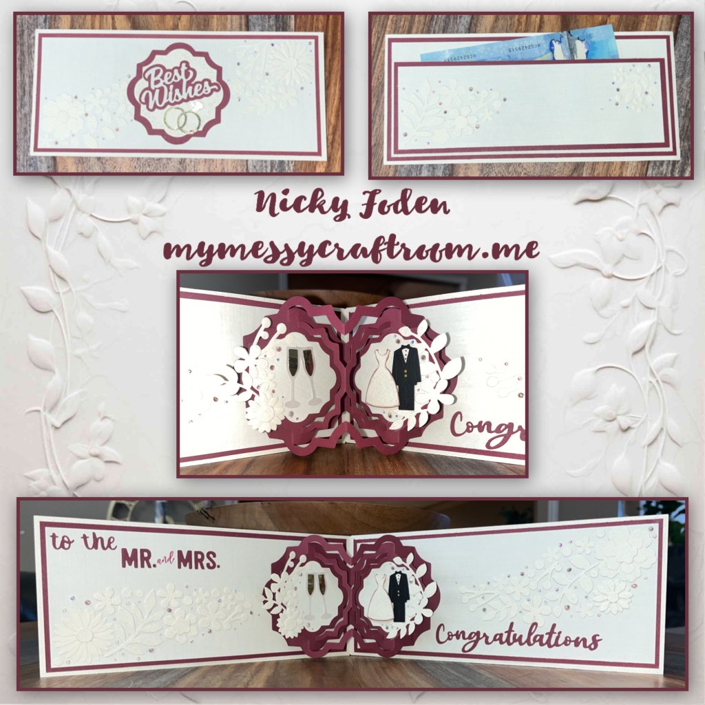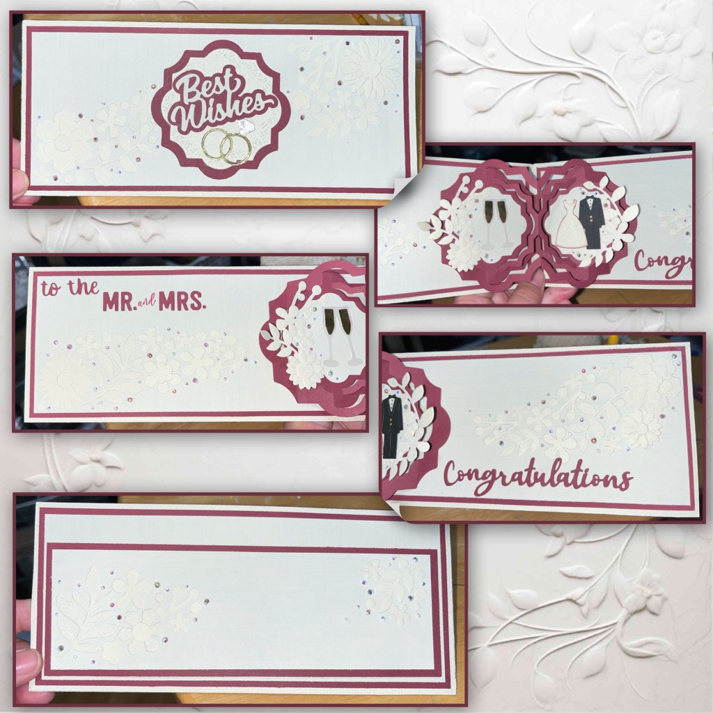 This card was made by request for a friend of mine, I’m kind of her personal card maker lol. She needed a wedding card and just by coincidence the wedding party was wearing burgundy, I didn’t know that when I made the card. There is actually quite a bit of tone on tone details that looks much better in person.