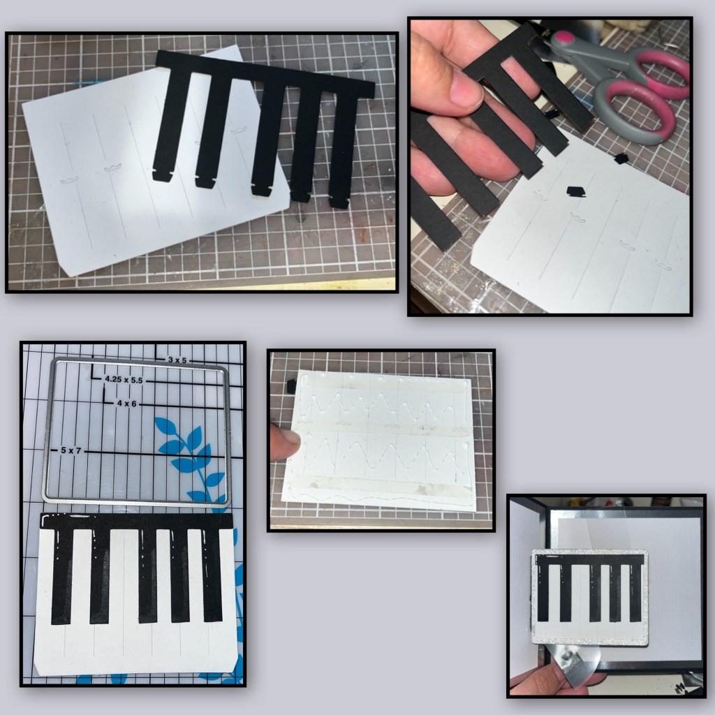 The Piano Keys Pop up is meant to pop up, but I couldnβt make that work with the mechanism I chose so I cut out the pieces, and trimmed off the pieces from the black that is meant to attach to the white and just glued them on flat. I added shading with a Versa Mark Marker, and highlights with a white Gelly Roll pen. This piece is roughly the same size as the glitter rectangle so I trimmed a bit off the bottom and both sides. I wasnβt sure the best way to glue the key board to the glitter so I used both wet and dry adhesives.