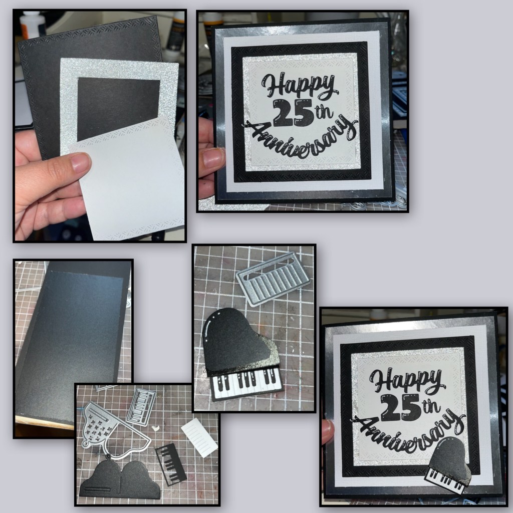 For the front I layered some squares using the Squares Crosshatch. I added Happy Anniversary , and the 25th is from the Numbers set. To make the piano I used chalkboard paper stuck to cardstock and used the Music Charms dieset to make the piano, I added shading with a Versa Mark Marker, and highlights with a white Gelly Roll pen, and added to the card.