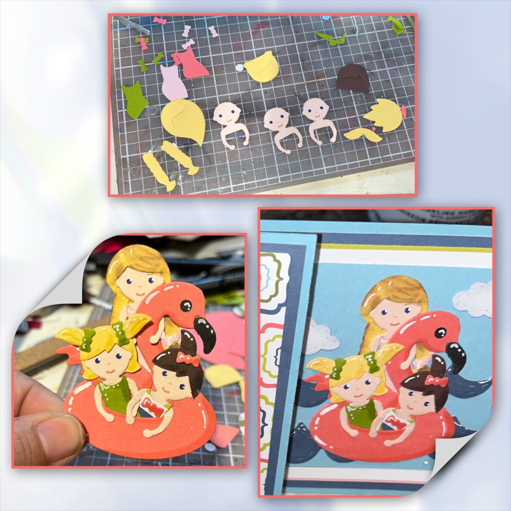 This is how I met the perimeters… the card is an 4”x 8” slimline card, mountain colours are the blue sky, green grass and the colours of wild flowers. The flamingo is a floaty, and it’s riding the water waves. The Circle Charm Pop up is the set I have never used, and the floaty from Tiny Sets 4 is from a set that I haven’t used in a while.