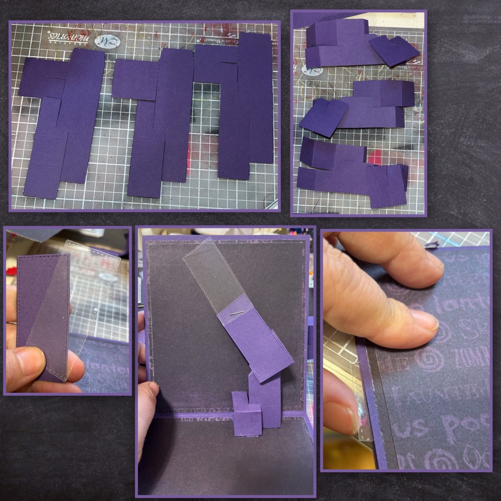 Using the largest Square Crosshatch, and pieces from the Castle Pop up I assemble the first section. With the tower it was too tall, even with the wall it was still a bit too tall so I had to trim a little bit off the bottom of the purple square.