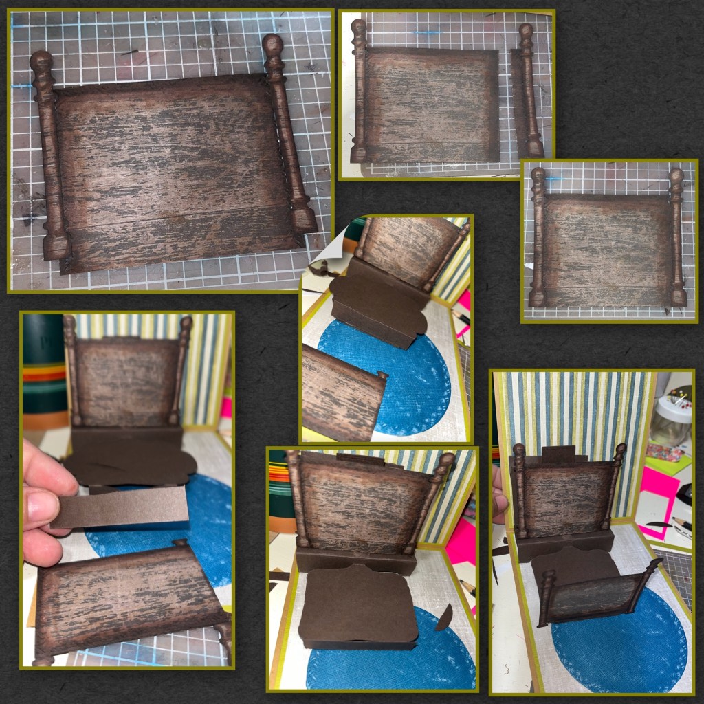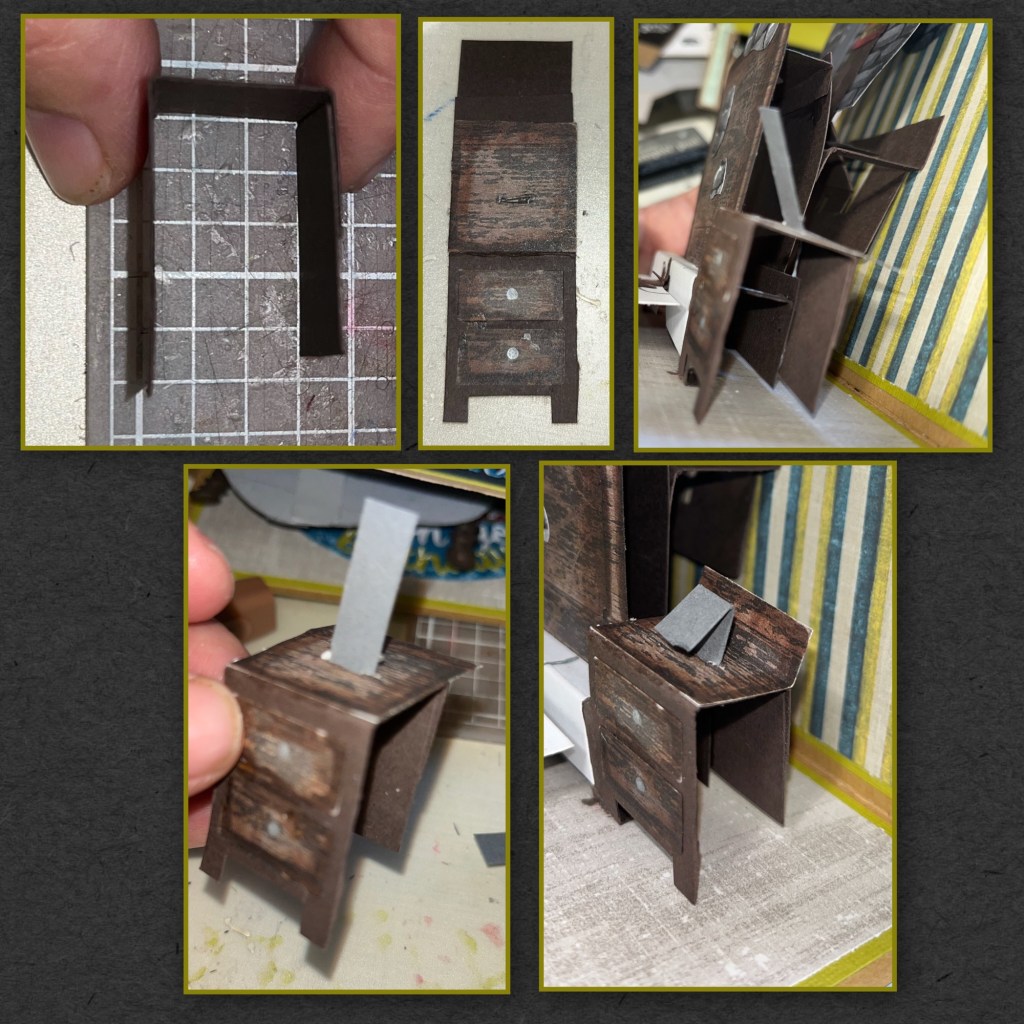 I decided to fill in the space beside the bed by making a night stand. Using the drawers from the Oven Pop up as reference for width I made the night stand 1 1/2” tall, 3/4” deep, and 3” long in the back. I used alcohol markers to make it match the bed. I put a slit in the top and added a small strip of grey cardstock as shown. I added it to side of the bed as shown.