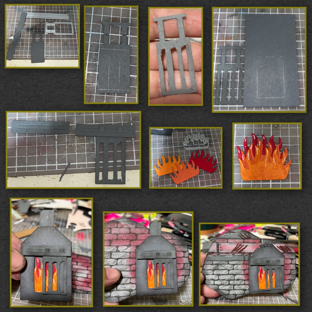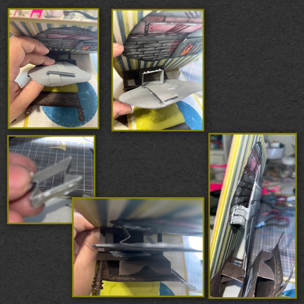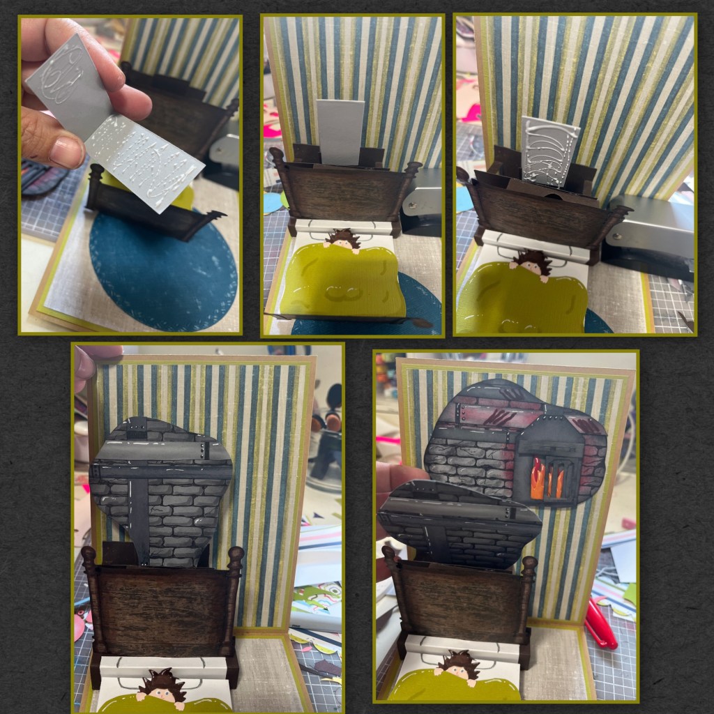 I converted the barn door from the Barn Pop Stand into the furnace door, I trimmed the track as well. My intention was to have it open and close but it didn’t glide very well. I hand cut the furnace using the door as reference for size. I used the fire from the Fire Place Pop up. I added some red ink to the bricks to make it look like a hot glow. I hand cut some pipes and coloured with grey and red ink and drew on the blade swipes. Add all the elements and trim the edges of the furnace that over laps the edge of the dream bubble.