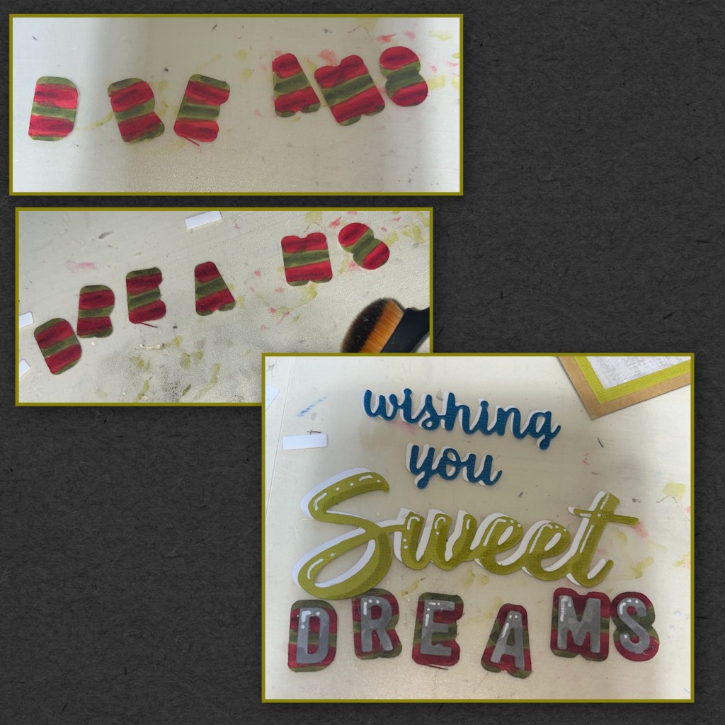 I diecut “dreams” using the Mini Alphabet and Numbers, the shadow from white and I used alcohol markers to colour them to match Freddy’s sweater, and the letters from grey. “Wishing You” and “on your” is from Word set 18-Connectors, and “Sweet” from You’re Sweet. Birthday is from Word set 2- Birthday, I added white shadows as shown and I added shading with a Versa Mark Marker, and highlights with a white Gelly Roll pen