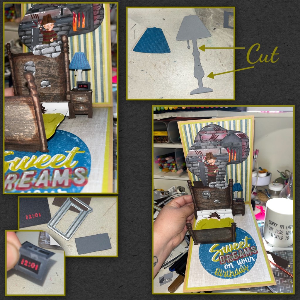 To make the lamp I used the lamp from the Family Room Pop up and cut where shown, then adhered the pieces back together but making it shorter. I used the door from the Holiday House to make the alarm clock I printed the numbers on black card stock with a white pen, when it dried I added red over the white, trimmed and then added to the clock. I drew the buttons on the top with a black marker. I added the clock to the grey cardstock sticking out of the night stand. I added the the lamp to the back side of the clock.