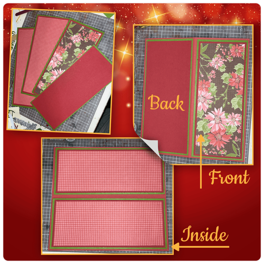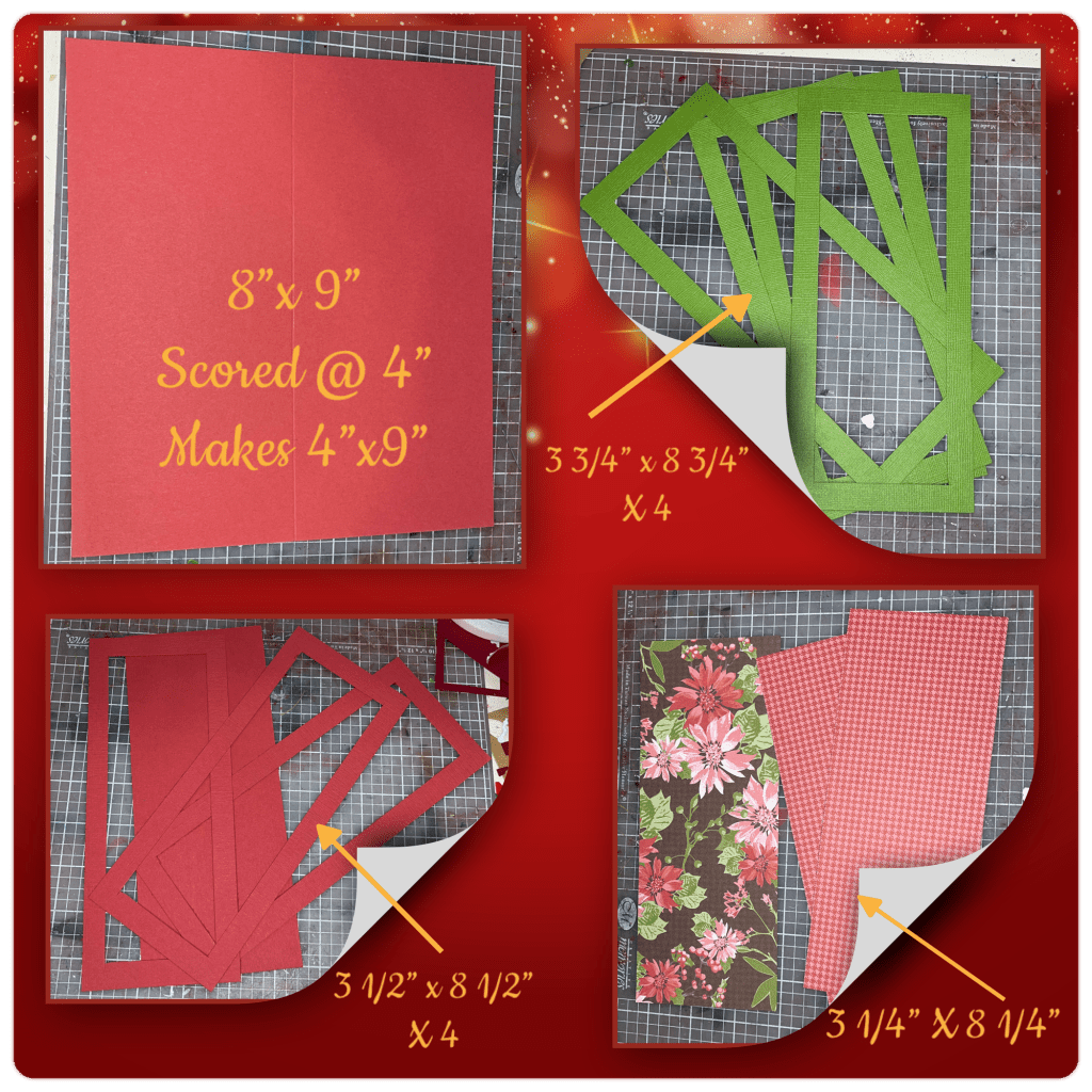 I was planning on using the Twist Flower Pop-up so I needed to make a slimline card. Dimensions are below. I cut the centers of all the green layers, and 3 out of 4 of the red layers. The patterned pieces are all the same size and I have 2 of the red pattern, and 1 of the poinsettia. I cut the centres out of the pieces that will be covered anyway, it reduces the bulk and conserves cardstock.οΏΌ