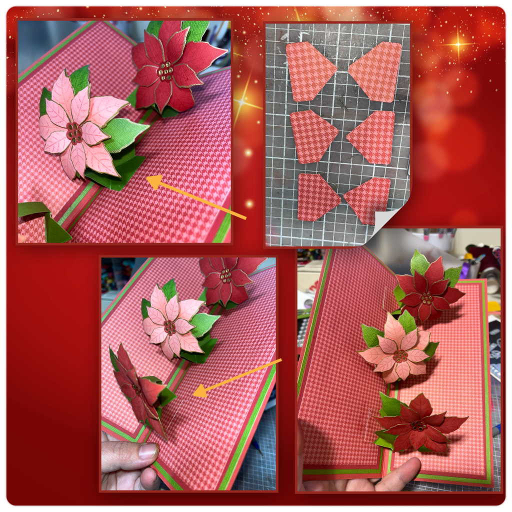 I die cut Poinsettias from the 2 shades of red, and 1 pink. I pressed the dies into matching ink before diecutting to make the lines in the poinsettias more prominent. I then sponge the edges and used a gold marker along the edges as well. The centres are gold mirror card stock.οΏΌ I wanted different sizes of leaves so along with the leaf die I die cut the large poinsettia and cut the petals off for leaves. I inked and edged the leaves the same as the flowers.οΏΌ