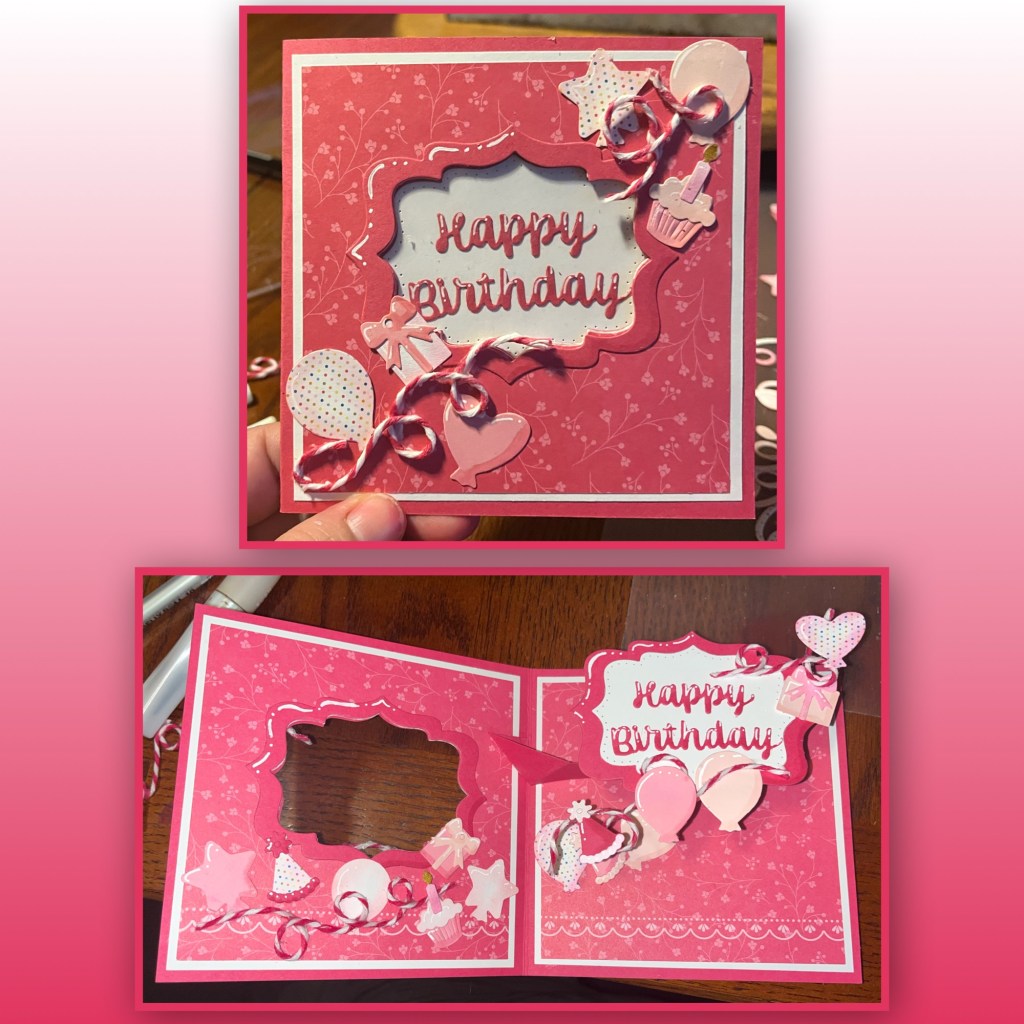 Using the nesting dies in the set I made a couple of frames and the label for the pop up. I added Happy Birthday to the label. I added shading with a Versa Mark Marker, and highlights with a white Gelly Roll pen as shown.
