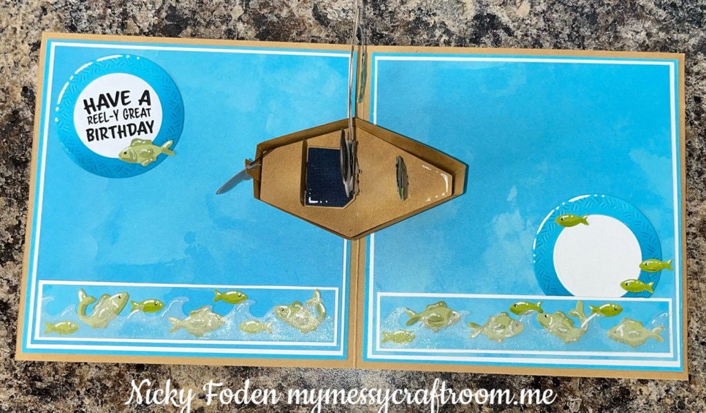 I layered some larger circle from the Circles Crosshatch, to cut back on the bulk I die cut the small white circle out of the large circle, then layered as shown. I added some of the fishing elements from the Fishing Boat Add ons. Using the Happy Birthday Lorna Add on, I fussy cut the greeting from the label. I had to diecut it twice because the letters slightly over lap.