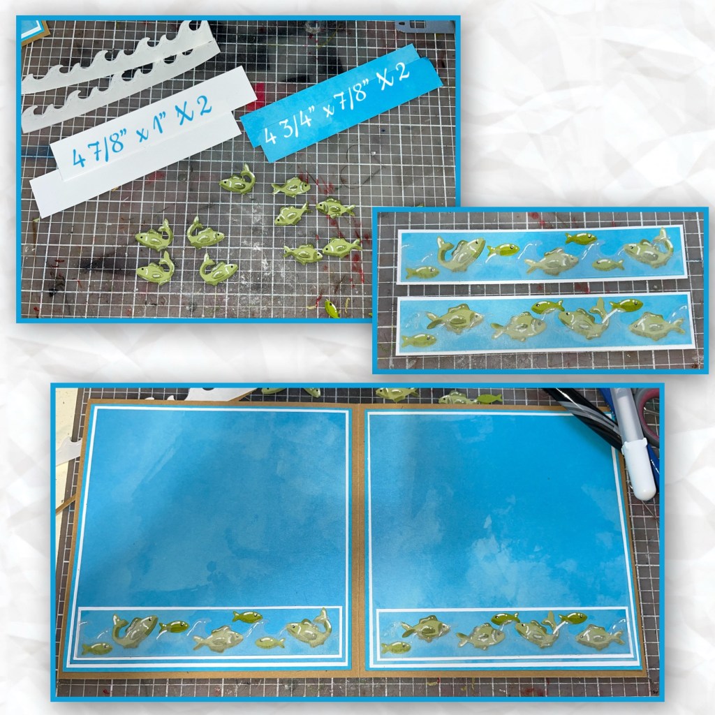 It is hard to see but I did use the new Ocean Edges on the border inside the card. I cut the border panels as shown below, I added vellum to double-sided adhesive and then cut the waves. I cut the fish from the Fishing Boat add on and I added shading with a Versa Mark Marker, and highlights with a white Gelly Roll pen. I layered the pieces as shown, having some of the fish under the Vellum wave and some over. I added wink of Stella to the Vellum to give it a little sparkle because it was hard to see and added it to the cardbase.