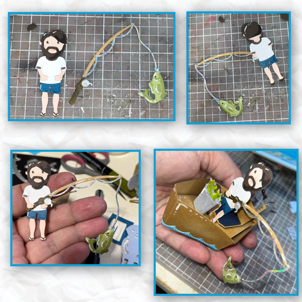 I cut the Boat pieces and the Fishing Boat add on pieces (Karen will have an assembly video posted soon) I assembled the boat and I added shading with a Versa Mark Marker, and highlights with a white Gelly Roll pen.