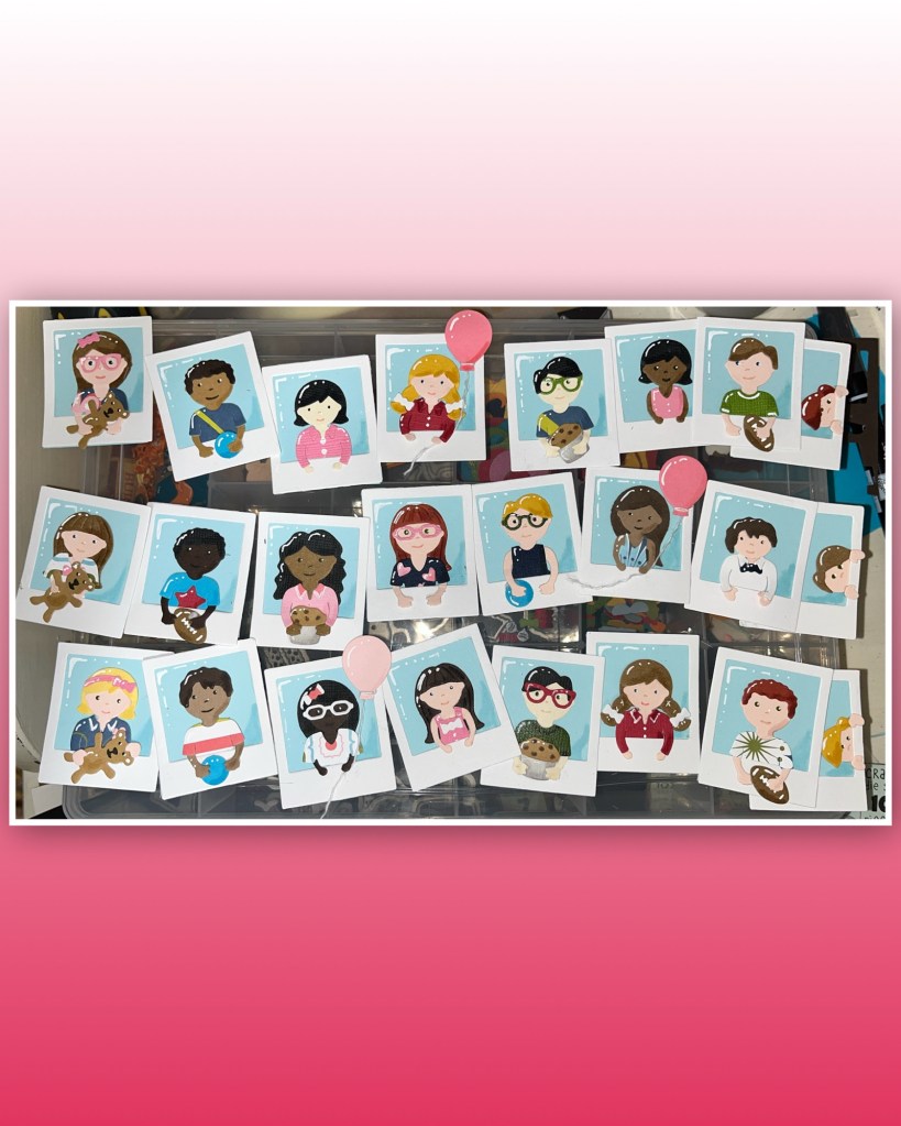 I choose a fun patterned paper from my stash for colour inspiration. I cut out several of the photo frames (13 needed per card) and blue backgrounds. When I diecut I try to cut as many pieces from a colour at the same time so I cut out pieces from the Paper People, Princess and Mermaid, and the Tiny gnomes, from multiple skin tone colours. I also chose multiple hair colours. The clothes and accessories were cut from colours in the pattern paper. Some of the shirts were even cut from coordinating paper patterns
