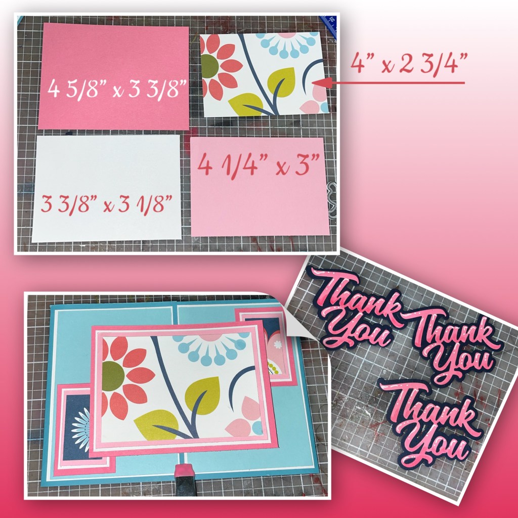 I decided to add my front panel on a diagonal, being mindful to only add adhesive to what will be the left side. I added the last of the photo frames and the “Thank You”.
