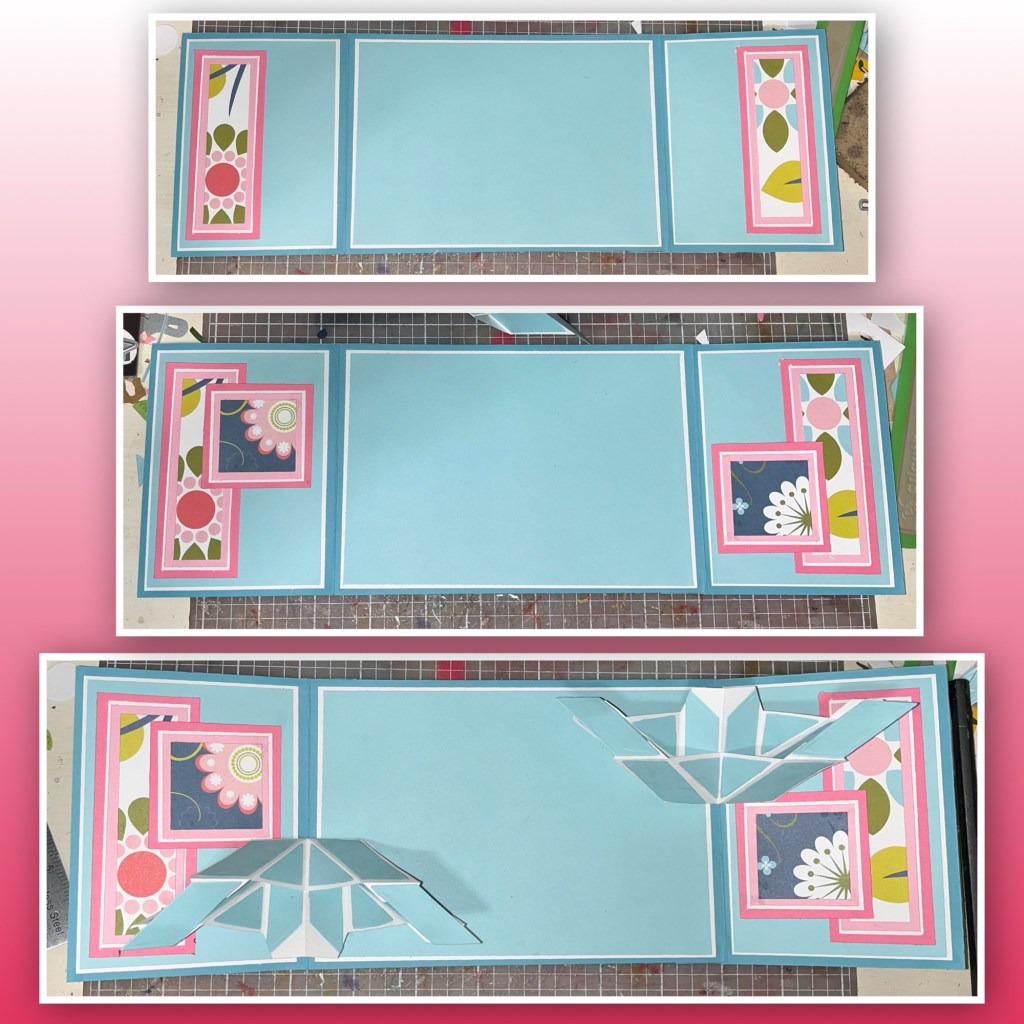 I added the panels and the mechanism as shown. I had to put the one on the left upside down, to have it as low as I wanted it. Otherwise, the mechanism folded down, so it would go beneath the limit of the card. It will be visible when the card is closed. With having them added to the card this way the left one folds up, the right one folds down when the card is closed.