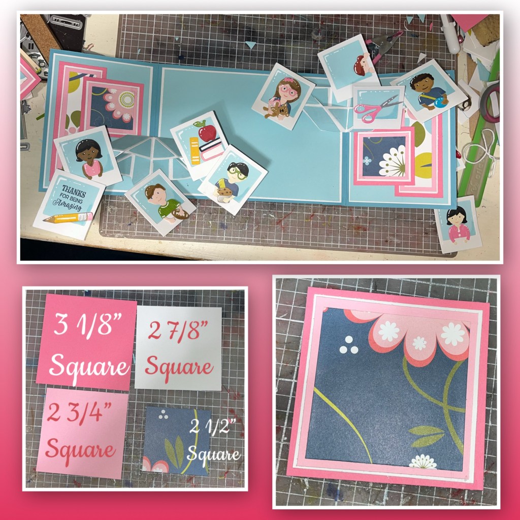 I started adding my little characters and school supplies. Opening and closing the card after each to watch for catch points or jamming in the folds. I wanted a square in the middle so I cut one to the dimensions below. I wanted it bigger, but I had pretty much used up most of the dark pink card stock so I wasn’t gonna have enough and I wanted to follow the same pattern of colours that I had used so far.