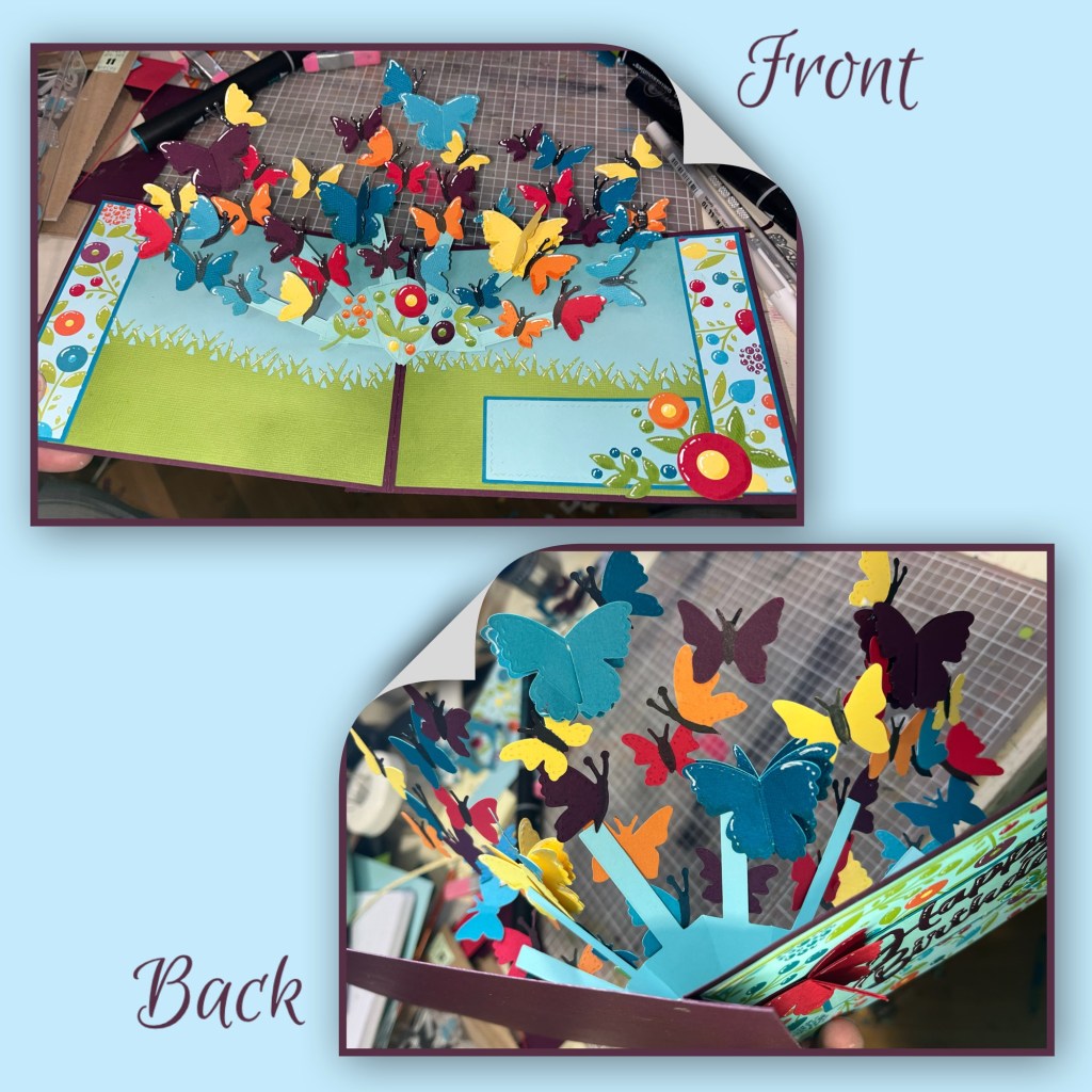 HELP HINT: I triple layered some of the largest butterflies but they were too floppy and kept getting hung up when closing the card. So I picked an angle that I liked and added a little bit of glue to where the wings meet in the middle, to keep them from flopping but they still have the dimension.