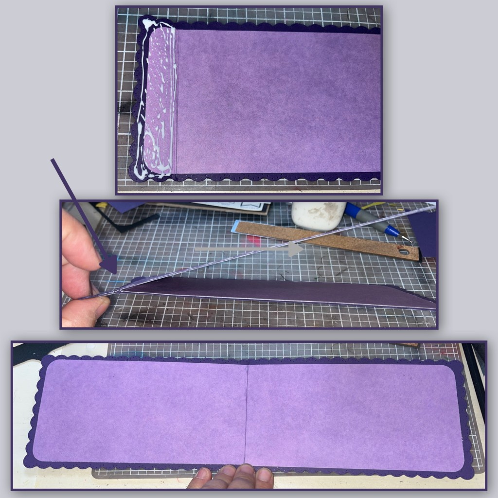 Using a purple paper I cut 4 pieces @ 7 1/2” x 3 1/2” I used a corner rounder and added them to the front and back of both pieces of cardstock. On what will be the back panel score 1” from one end.