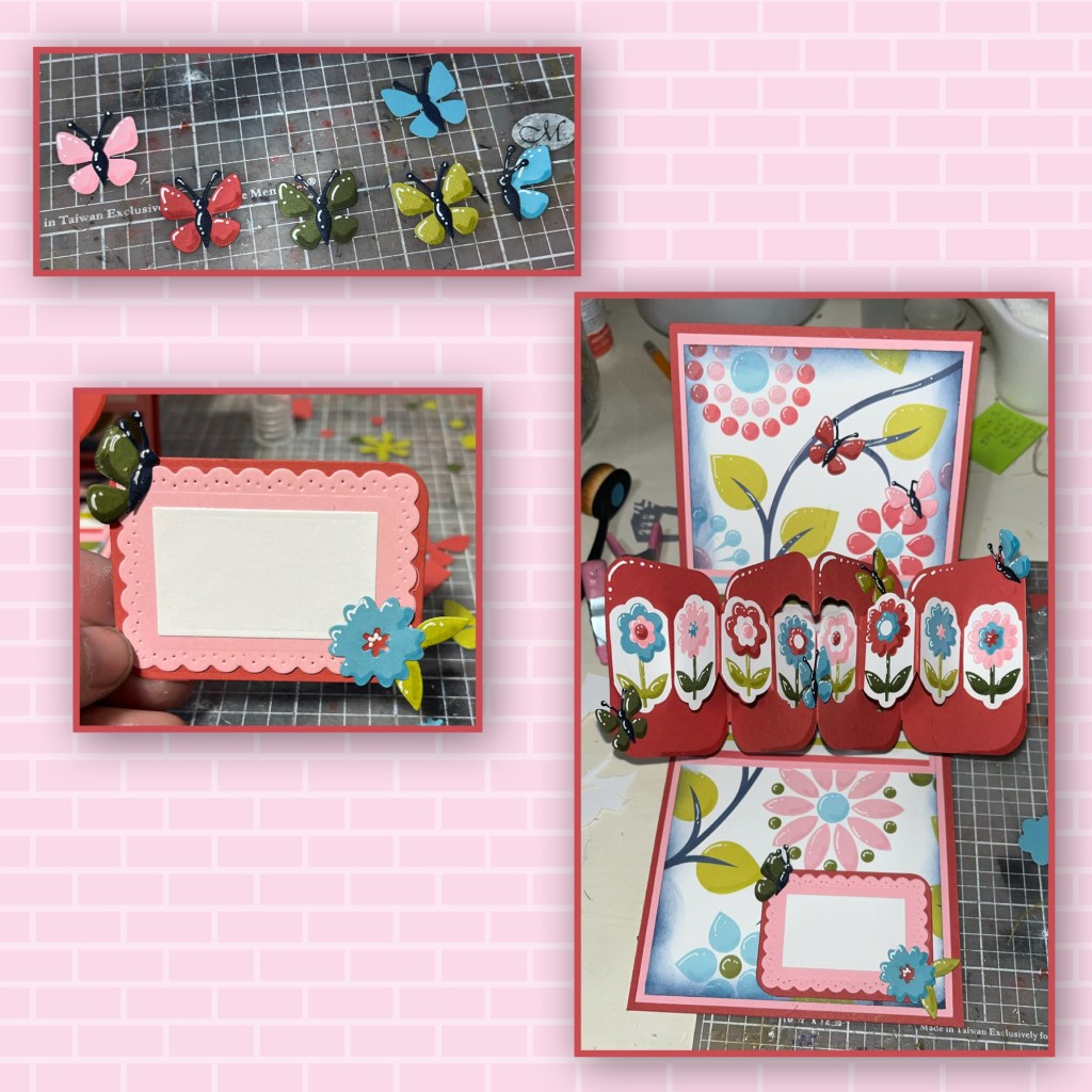 I cut and assembled the butterflies from the Flower Pot Add ons, and a block to use a place to sign using pieces from the Twist Panel Pop up. I added shading with a Versa Mark Marker, and highlights with a white Gelly Roll pen. I added all the pieces as shown.