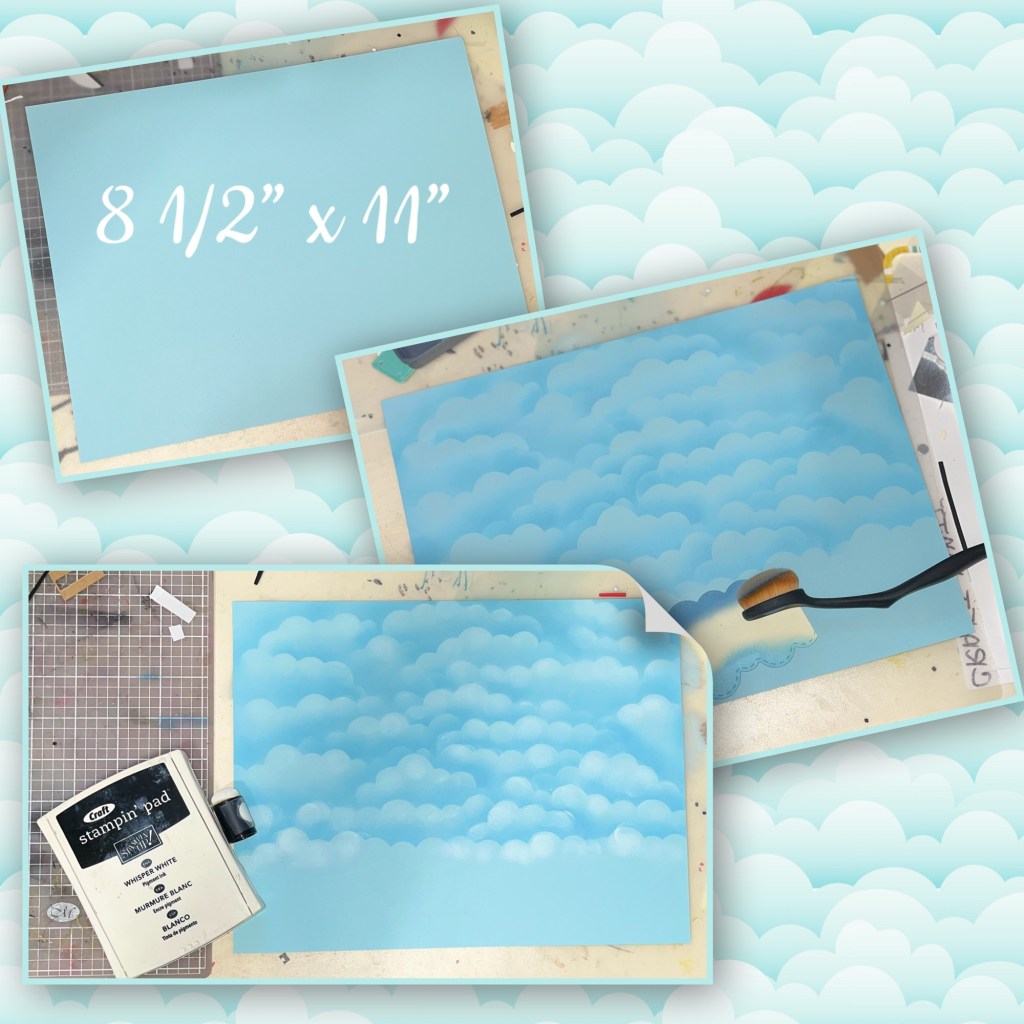 Using a whole sheet of light blue card stock I created my background. I made a stencil using the Natures Edges then I used it to make the clouds. I started at the top and worked my way down. To give the clouds more depth I used a sponge dauber and white craft ink and sponged the top of each cloud.