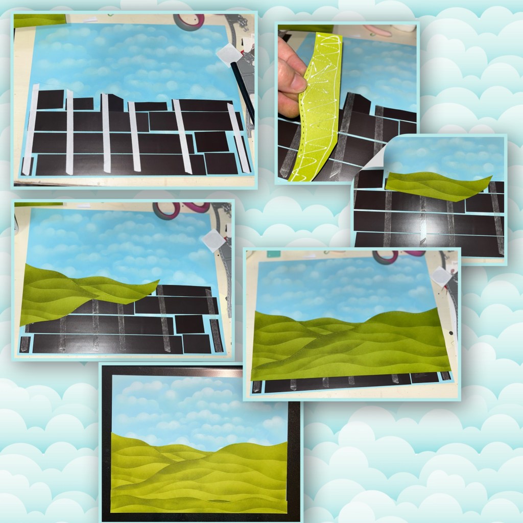 I wasn’t sure of the best way to use adhesive. So I used double-sided strips to the magnets, and liquid glue to the back of the hills. I also trimmed the hills so there wouldn’t be too many layers and cut off what wouldn’t be seen.