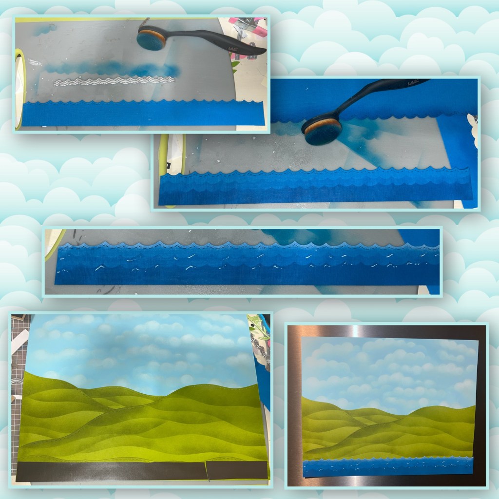 I cut a blue strip the cut the top edge using the Ocean Edges. I used the opposite edge as a stencil, I brushed the bottom the darkest and lighter as I went up. I used white craft ink and a dauber to add white to the top of the border. I also used a white gel pen to add highlights to the top of the waves. I ran a row of magnet strip and then the blue waves strip on the bottom of the hills.
