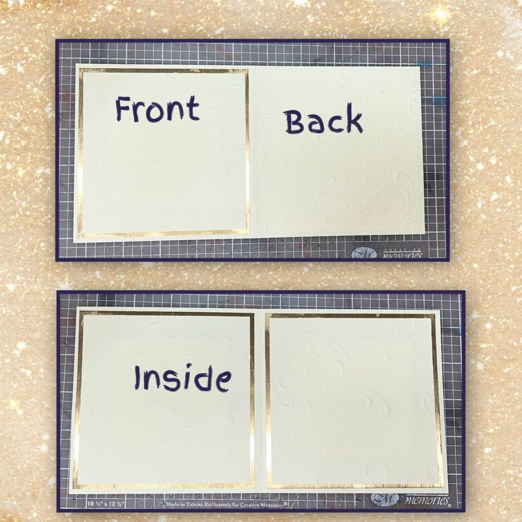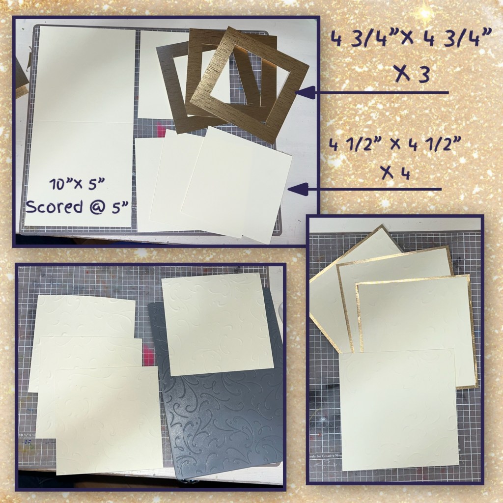 Not sure why Iām so obsessed with making square cards, but here I go again. Follow the dimensions below to make the card base and the panels. To conserve Gold card stock I cut the centres out, this trick also helps reduce some of the bulk. I wanted there to be a little interest in the panels. So I decided to pull out an embossing plate to emboss swirls into the top layer. You could use embossing folders I just liked this particular pattern. It is retired StampināUp. Add the top layers to the gold layers. The back of the card will not have a gold layer.