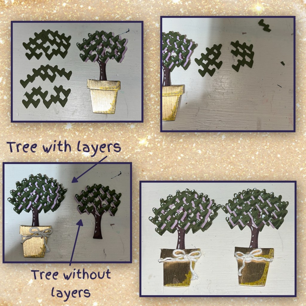 This little tree might look familiar, it is the tree from the Oval Frames Pop up, but she looked pretty tiny in her pot. So I decided to cut out more of the greenery part and a layer of purple. I slightly offset the purple and then cut the green into little chunks and layered it behind the purple to fill in all the blank space, I made it a little taller and a little rounder. The planter is from the Garden Charms cut from gold cardstock. I added shading with a Versa Mark Marker, and highlights with a white Gelly Roll pen. I pulled out one strand from a piece of Bakerās twine to wrap around and make a little bow on the planters. ļæ¼