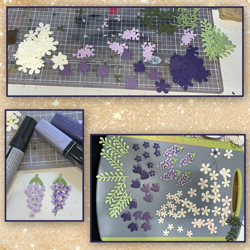 I had a specific look in mind so I pulled flowers from multiple sets. The Fence Add On, Fun Flowers, and Flower Pot Add on. Using two shades of purple alcohol markers, and a alcohol blender pen I added shading to all the flowers. I added shading to the greenery with a Versa Mark Marker, and highlights with a white Gelly Roll pen