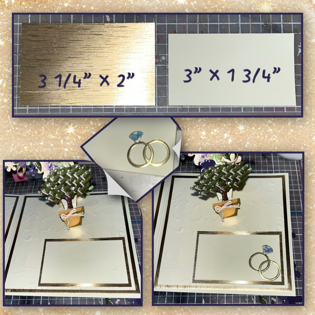Cut a piece of gold and a piece of cream coloured cardstock to the dimensions below. I cut and assembled the rings from the Wedding Charms set. Add to the card as shown.