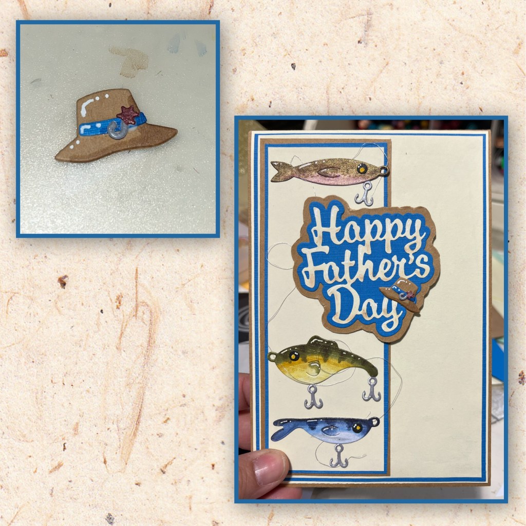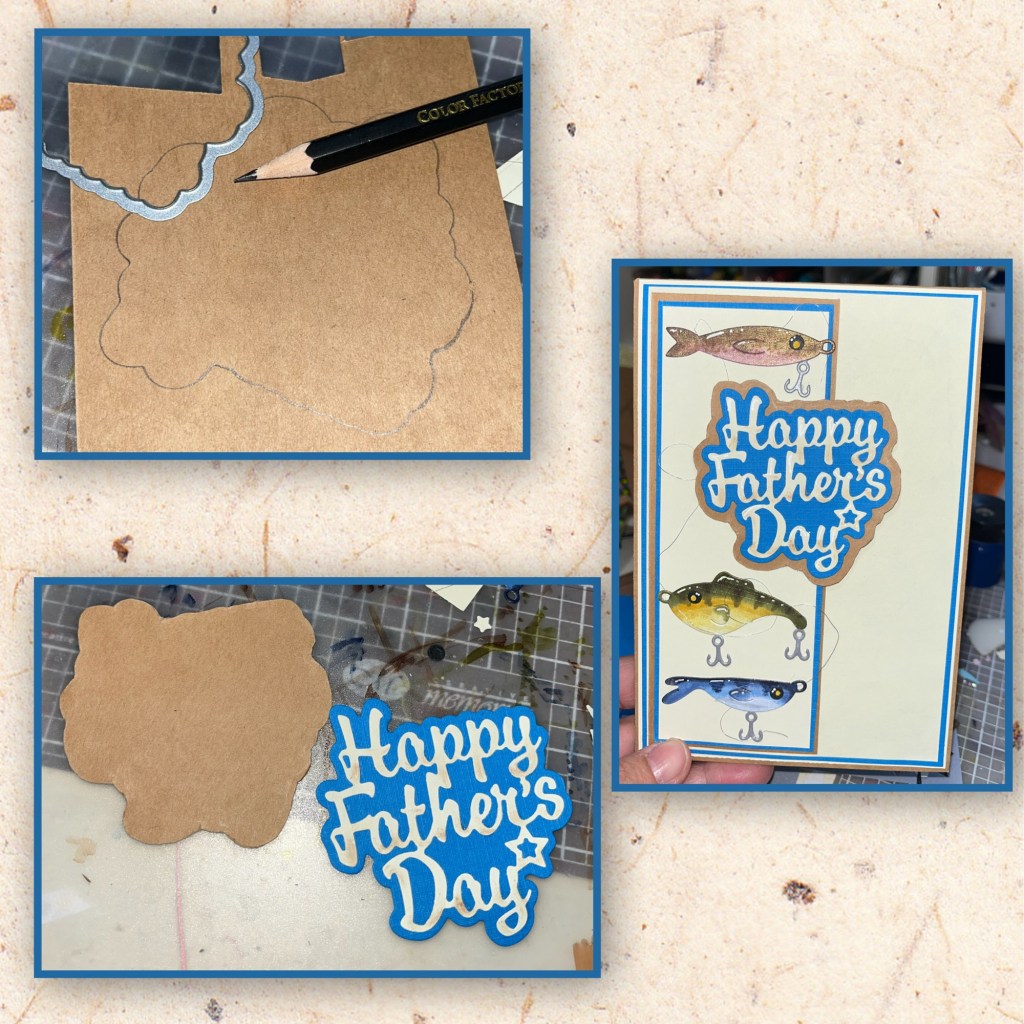 I wanted the Happy Father’s Day to have the brown layer behind the blue shadow piece. So I took the die for the shadow piece, traced around it, then hand cut it out and layered behind the blue shadow.  I lightly added shading to the happy Father’s Day, using a light brown alcohol marker and a blending pen. I added some lures and some thread to complete the border.