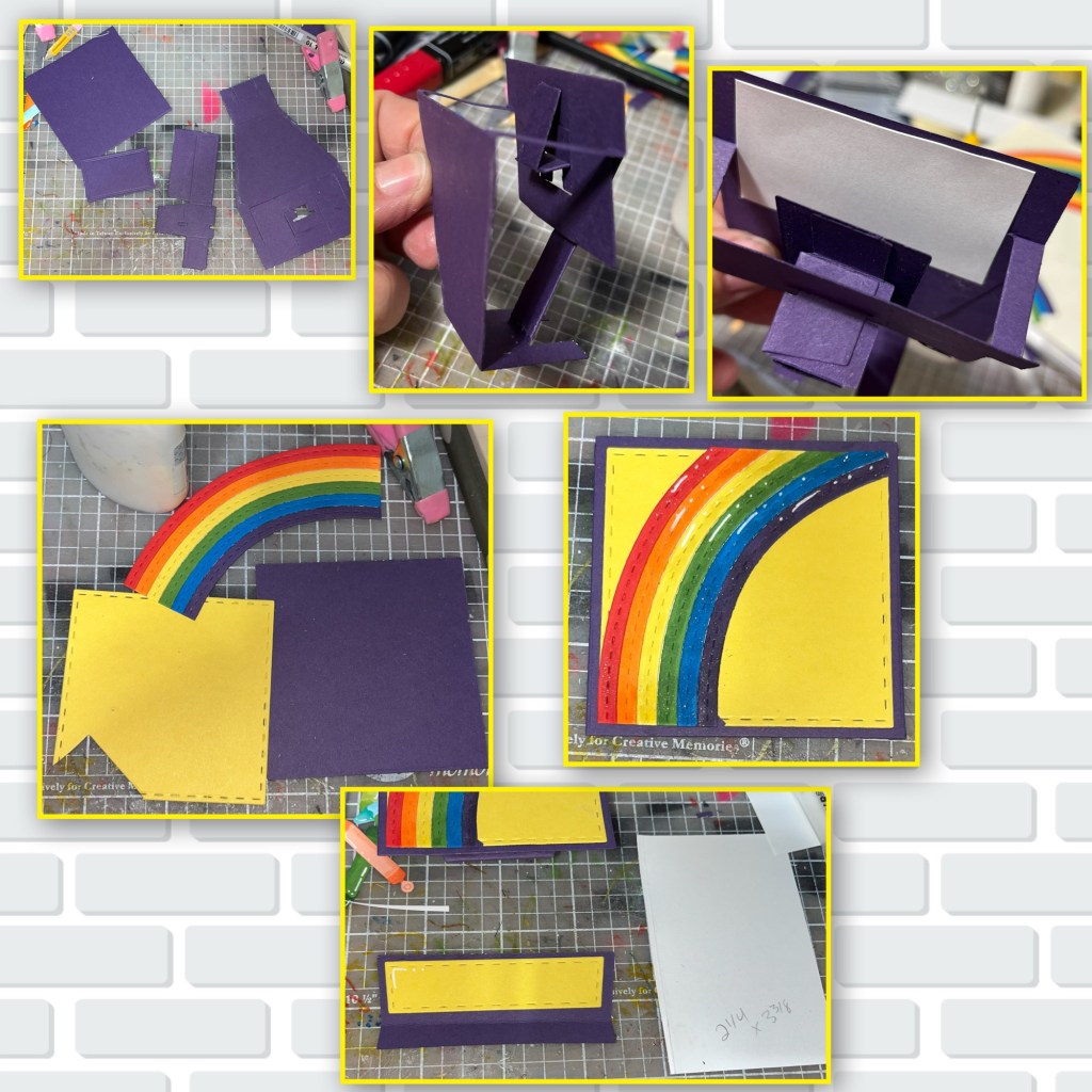 I wanted to make the crayon box interactive so I cut out the pieces to the Parcel Pop Up (Karen has a video tutorial on the product page at the link ⬆️ ) and assembled. I made the front yellow and added one of the rainbows to the front, I was running out of the yellow cardstock so as you can see it is missing a corner, but that’s ok because it is covered but he rainbow. I also added Wink of Stella to the rainbow to give a bit of sparkle. In Karens directions she adds a piece of tape to the inside of the mechanism to avoid creating a catch point. I couldn’t find my tape so I cut a thin piece of White cardstock and added to the inside and it did the same job.