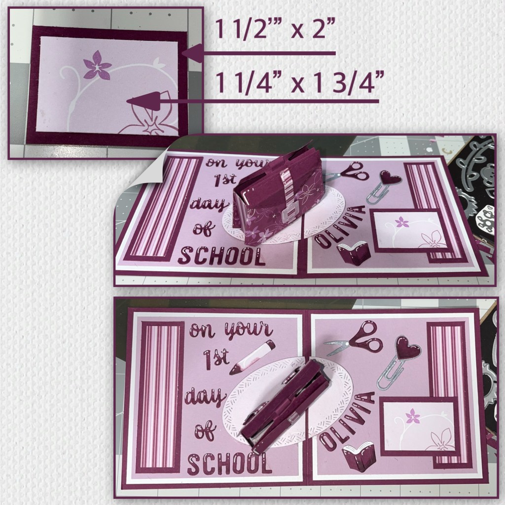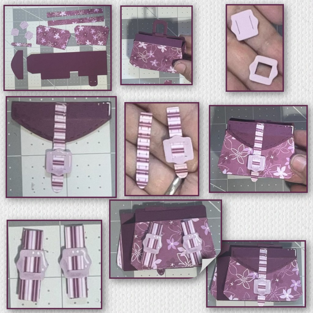I thought it would be cute to try and turn the Purse Pop Up into a backpack. (Karen has a video tutorial on the product page at the link ⬆️ on how to assemble and install the purse). To change it into a back pack I cut the handle off the top. I cut 3 buckles, and extended the strap that will go on the front. I cut 2 strips of paper to use as the straps, they are slightly too big to fit through the buckles so I cut the centers out of the buckle pieces and glued to the straps so it looks like the paper goes through. I add the pieces as shown, the flap and the long strap to the front and the two thicker straps to the back.