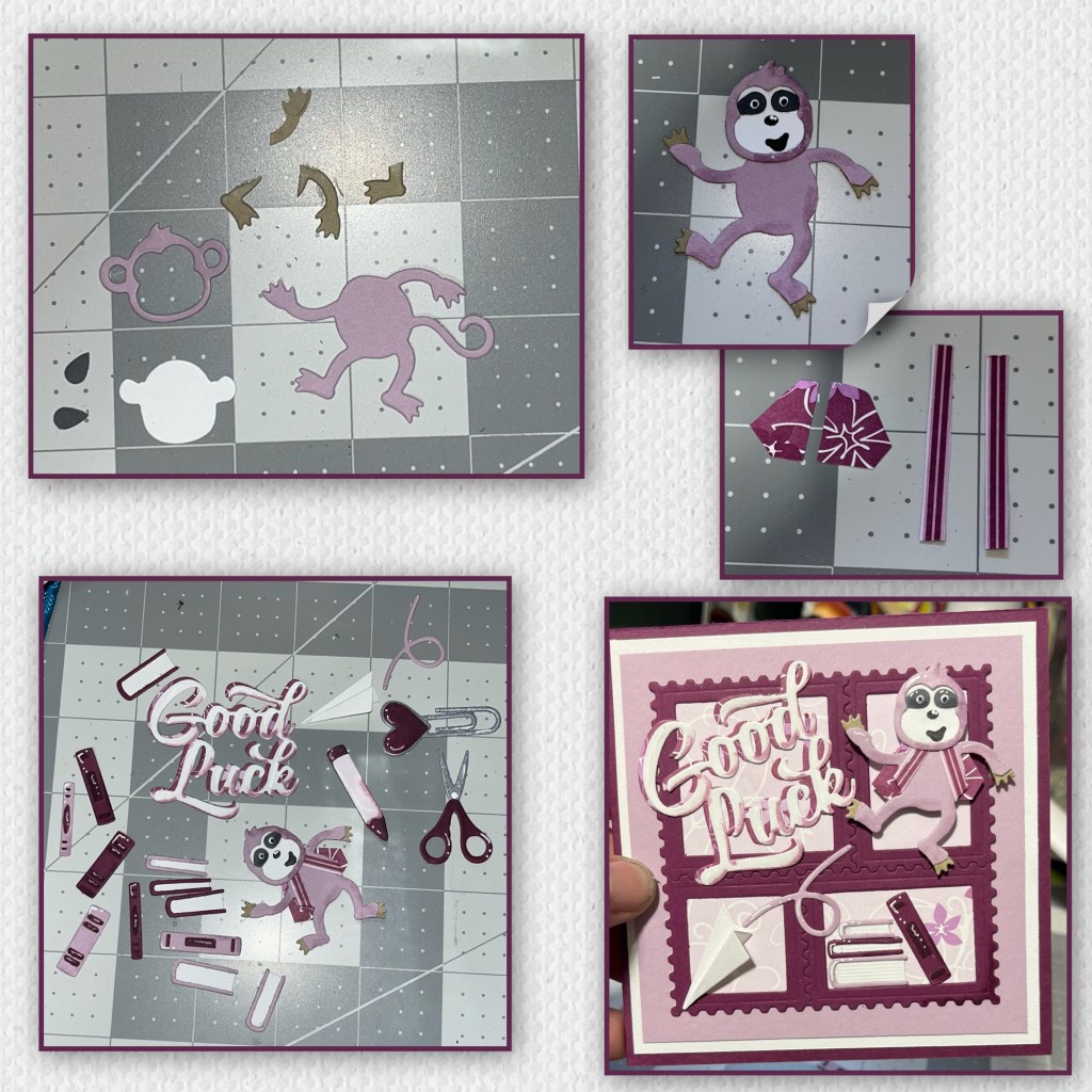 Now for the fuzzy little friend. My sweet girl just LOVES sloths, so I made one to resemble her favourite. I used this monkey die set and cut all the pieces as shown. I cut extra hands and feet from a light tan cardstock to make the claws. To make the grey mask pieces I used an older tear drop punch (I believe it was from Martha Stewart). I cut the ears and tail off. I also cut the end of the purple fingers and toes and the fourth fingers to make it a 3 toed sloth. I added the tan pieces to the hands and feet. I added shading with a Versa Mark Marker, and highlights with a white Gelly Roll pen. I hand cut the pieces to make a little back pack. I decided to split the back pack in half so I could line it up just right. I cut and assembled pieces from the Book Worm die, the Office Charms and a few pieces from the Postage Pop up set. I also cut out Good Luck out twice. One from the light pattered paper and one from the darker, I used an alcohol marker to add shading and a white Gelly roll pen for highlights. I added the pieces as shown.