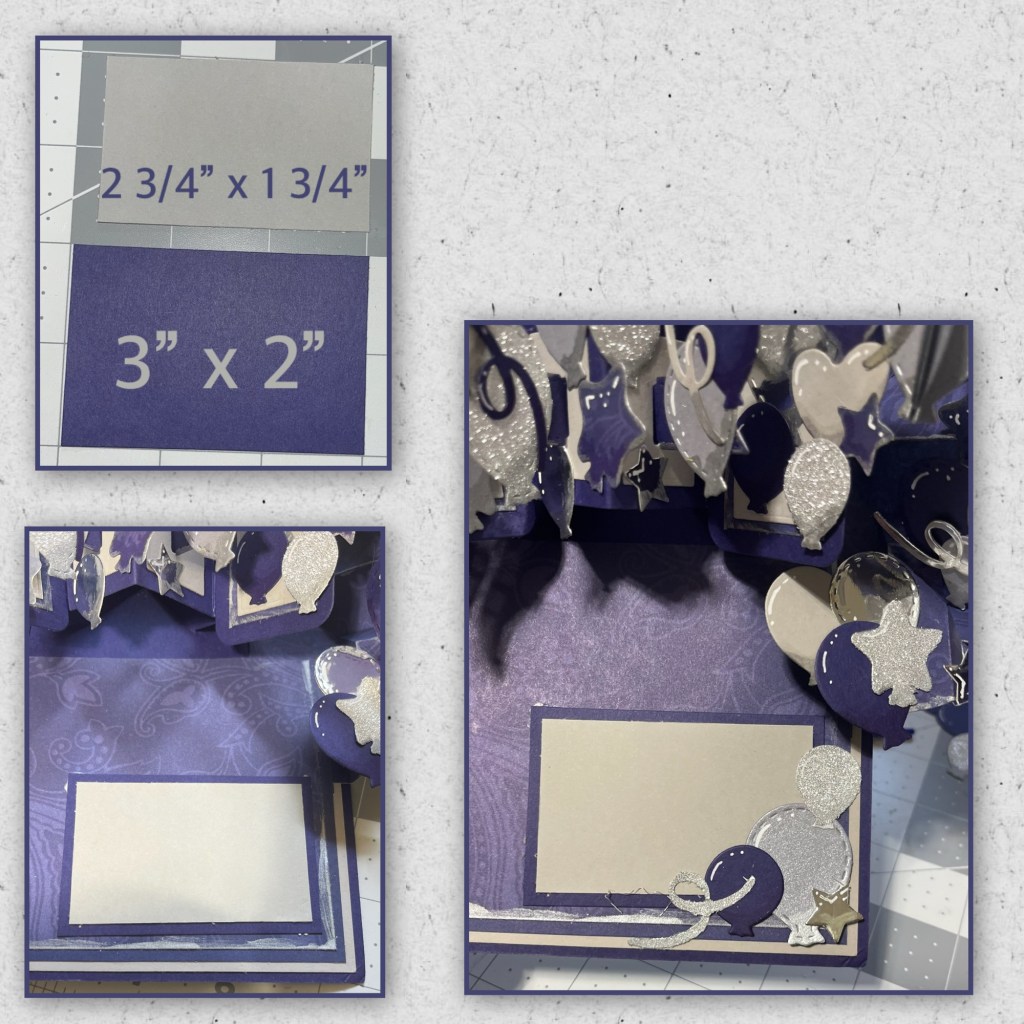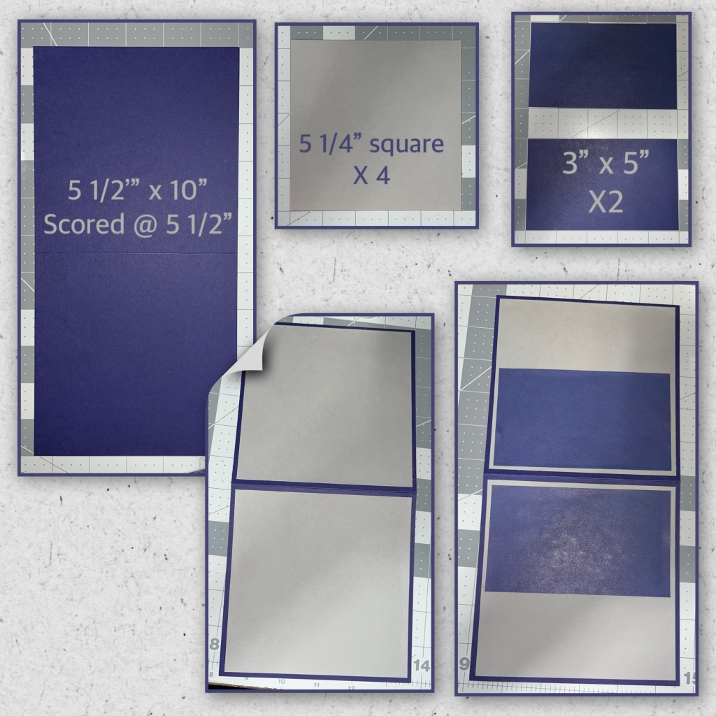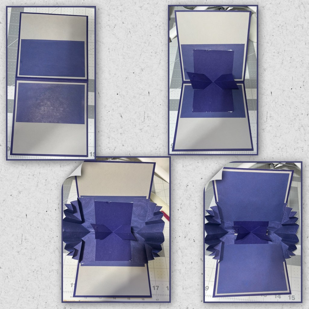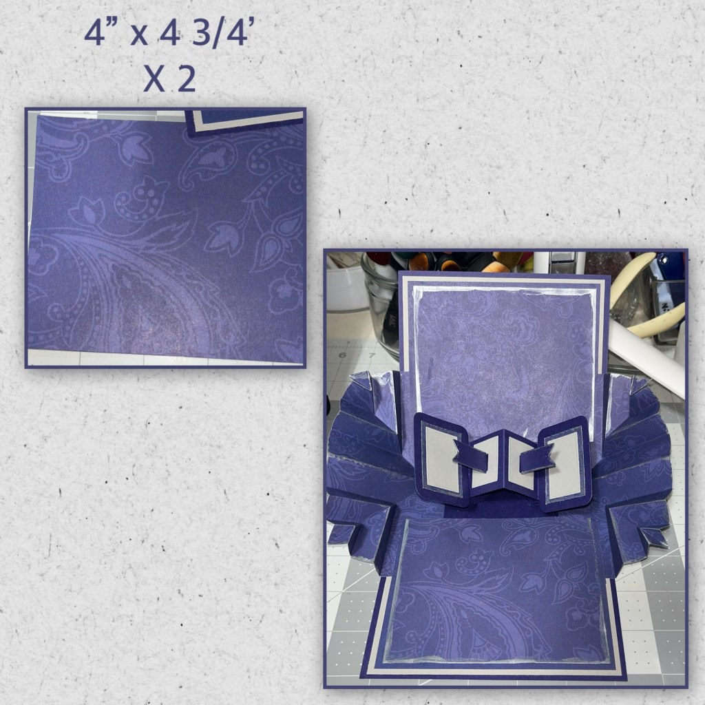 I love square cards ( I really donβt know why but I do) I cut the card base and the panels to the dimensions below. I knew by this part which mechanism sets I was going to use so I knew that the purple on the inside would have to get adhered in sections as shown below.