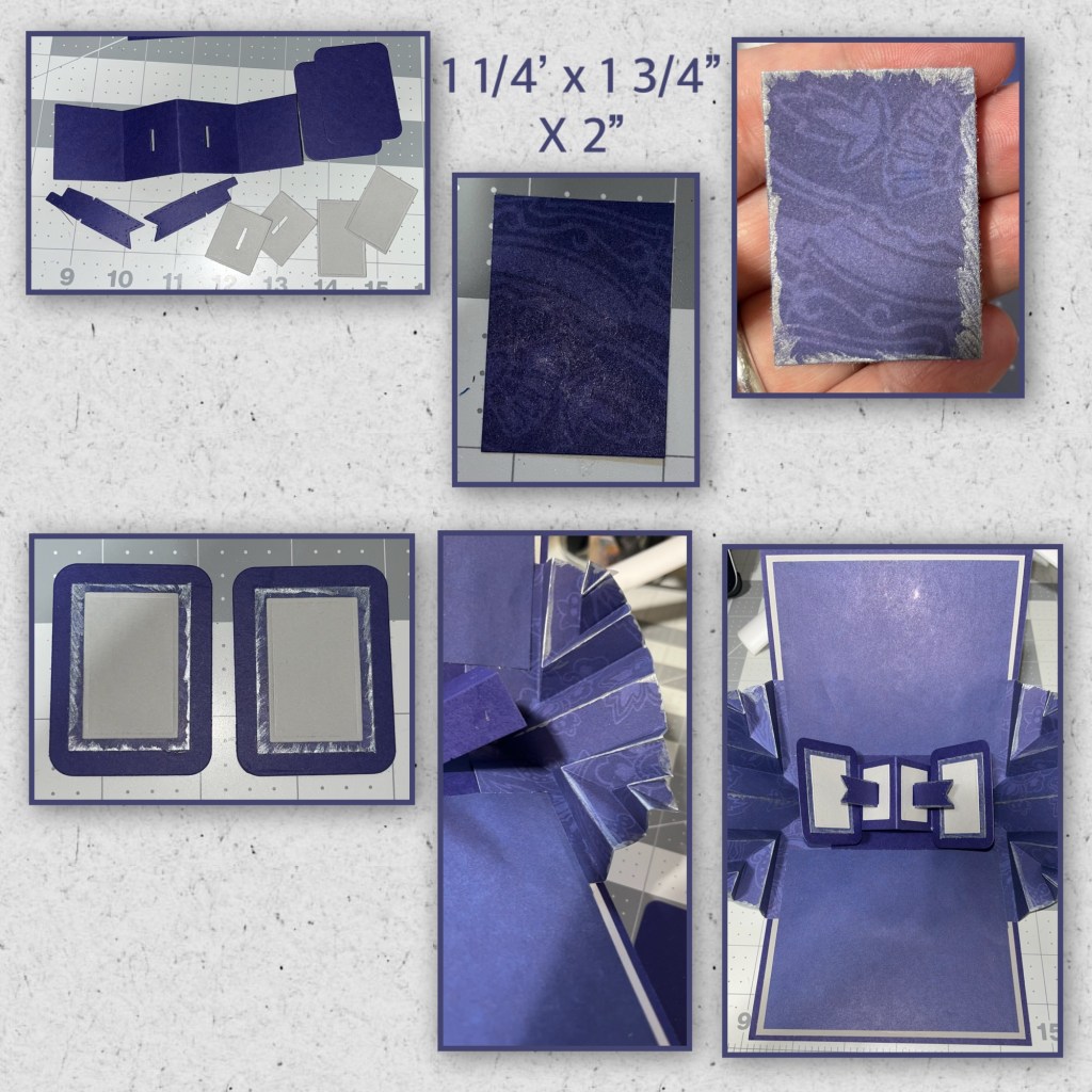 After I adhere the purple sections on the inside I added the Little Twist panel mechanism in the middle, then the two explosions side pieces. I cut 2 purple squares to 5β by 4 1/2β and added as shown.