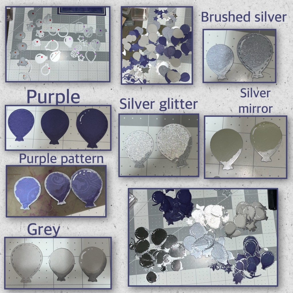 I wanted to cut a lot of balloons (Streamers and stars) at the same time so I used balloons from 3 sets, the Explosion Pop up, Balloon Collage add on, and the Party Balloons. To keep them organized I put a different colour sharpie dot on the back of each die, 1 colour per set. I cut balloons from the different card stocks shown below. I used the silver paint to add shadows to all the silver balloons, and I used alcohol markers to add shading to the other balloons. I also added silver paint to the edges of the patterned paper balloons. I added white Gelly Roll pen to all of the balloons for highlights.