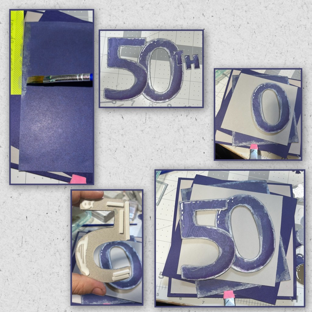 I figured this card out as I was making it and I wanted to have a lot of dimension. I went through my stash of things and found some chip board numbers that Iβve had forever and decided I wanted to have a big 50th on the front. I traced the 50 on to the back of the patterned paper on the reverse side then cut ad glued it to the front. I pressed it in between some books to get the paper to glue flat to the front of the chipboard. I used an emmory board (or a sanding block) to sand the edges of the 50. I diecut the βTHβ using the Alphabet set. I cut them twice from the purple cardstock and once from the patterned paper then layered them all together. I used some silver acrylic paint along all the edges.