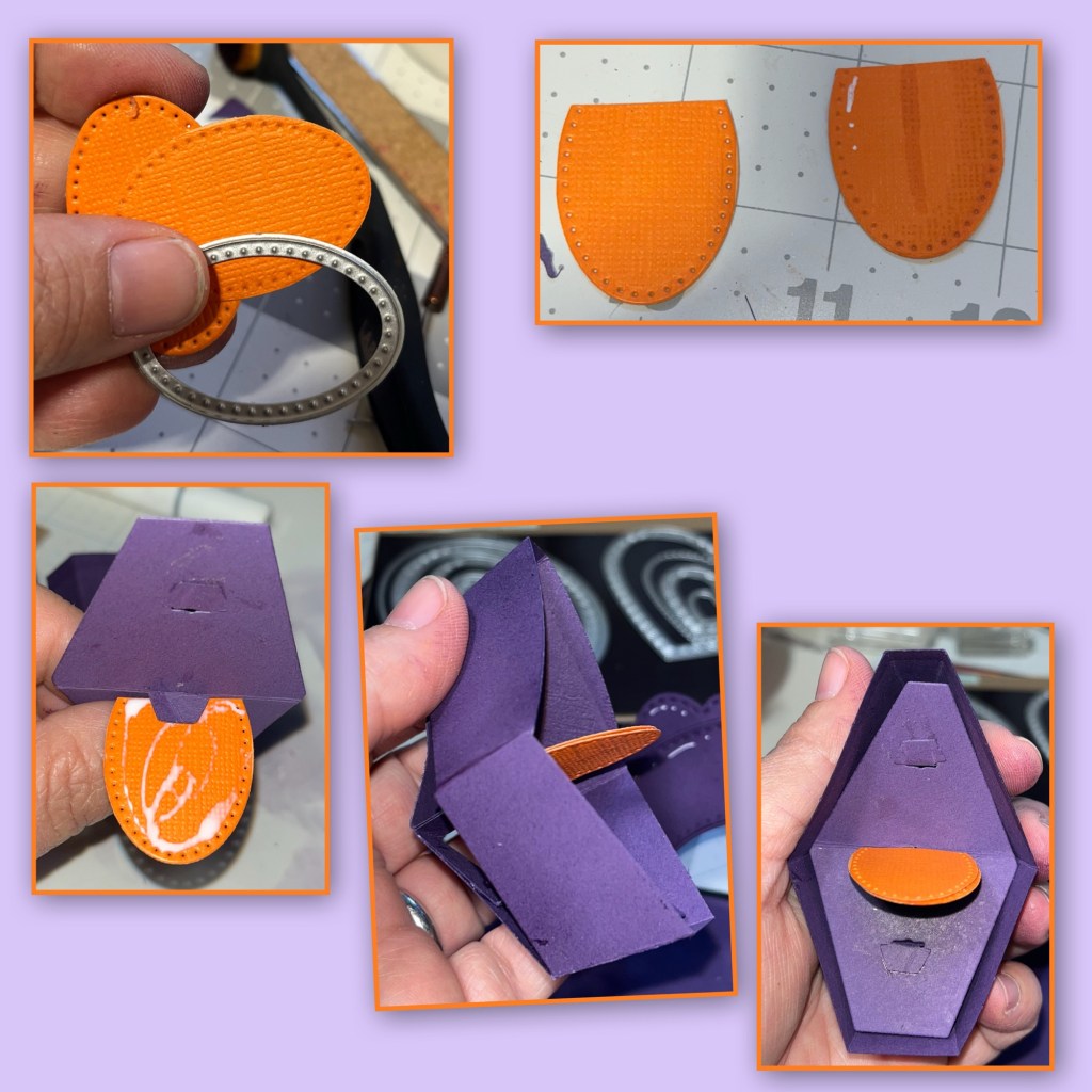 I cut and assembled the Boat Pop Up (Karen has a video tutorial on the product page at the link ⬆️ ) from the purple cardstock. I cut a tongue from orange cardstock using a small ova die (sorry I forget which set I grabbed the oval from but any small oval will work). I attached the tongue to the middle part of the boat, where the sail would attach if you were to attache the sail for the sailboat.