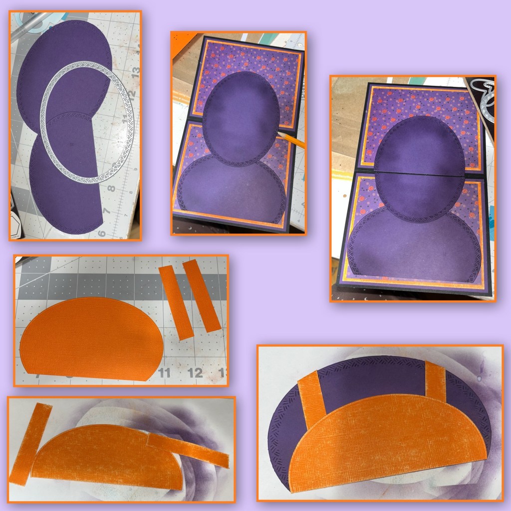I used the largest oval from the Ovals Crosshatch as shown. I brushed ink around the edges. I laid it out to decide where to cut the head in half and decided on roughly half. Make sure the boat mouth will cover the head without going over the edges. Using a smaller oval from the same Crosshatch set I cut a section from orange as shown to make the overalls. I cut two thin strips of orange as well. Because it is Core Color cardstock I roughed it up a bit, then added to the bottom purple oval.