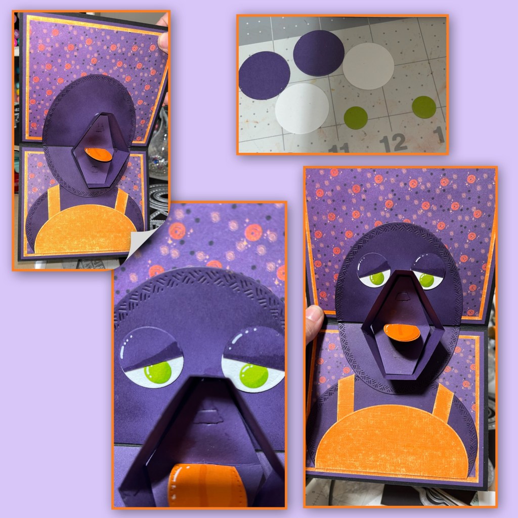 Next I added the boat mouth to the head. I cut 2 x 1” circles from both purple and white and 2 x 1/2” circles in green to make the eyes and added them as shown.