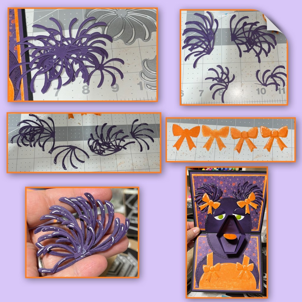 To make the piggy tails I cut out several Fire Works in the 2 shapes shown below. I cut them in half the I added shading with a Versa Mark Marker, and highlights with a white Gelly Roll pen then grouped them together. I used the bow die from the Parcel Pop up and cut it out 5 times from orange (1 will be used later). I roughed them up to match the overalls, then I added shading with a Versa Mark Marker, and highlights with a white Gelly Roll pen. I added 2 bows to her hair, and 2 to the overalls.