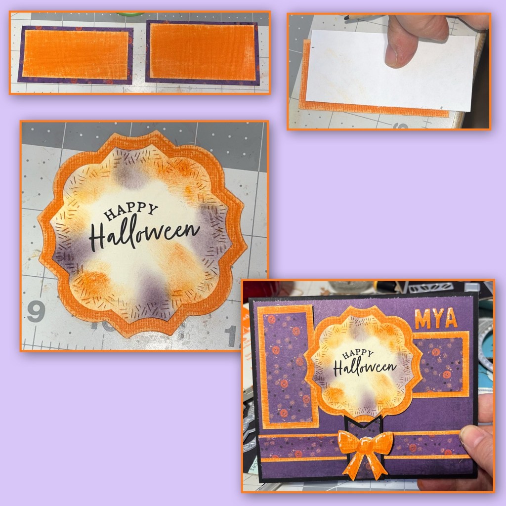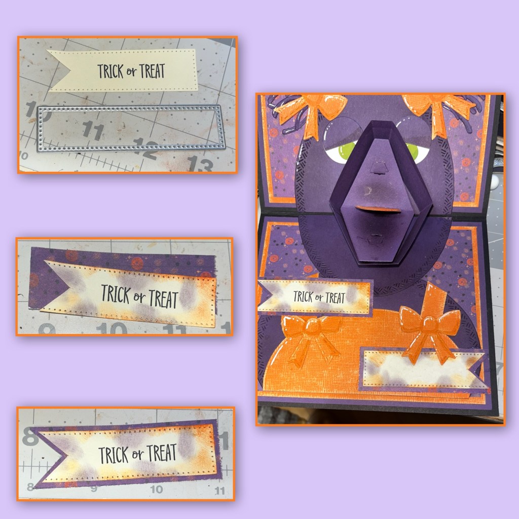 I used the new Halloween Phrases stamp sets to stamp “Trick or Treat” then I cut it out using the smallest rectangle in the Short Rectangles Crosshatch, then cut the end into a fish tail. I sponged the edges with purple and orange ink then cut a matt about 1/8” bigger. I cut a matching piece for a place to sign, then added to the card as shown.